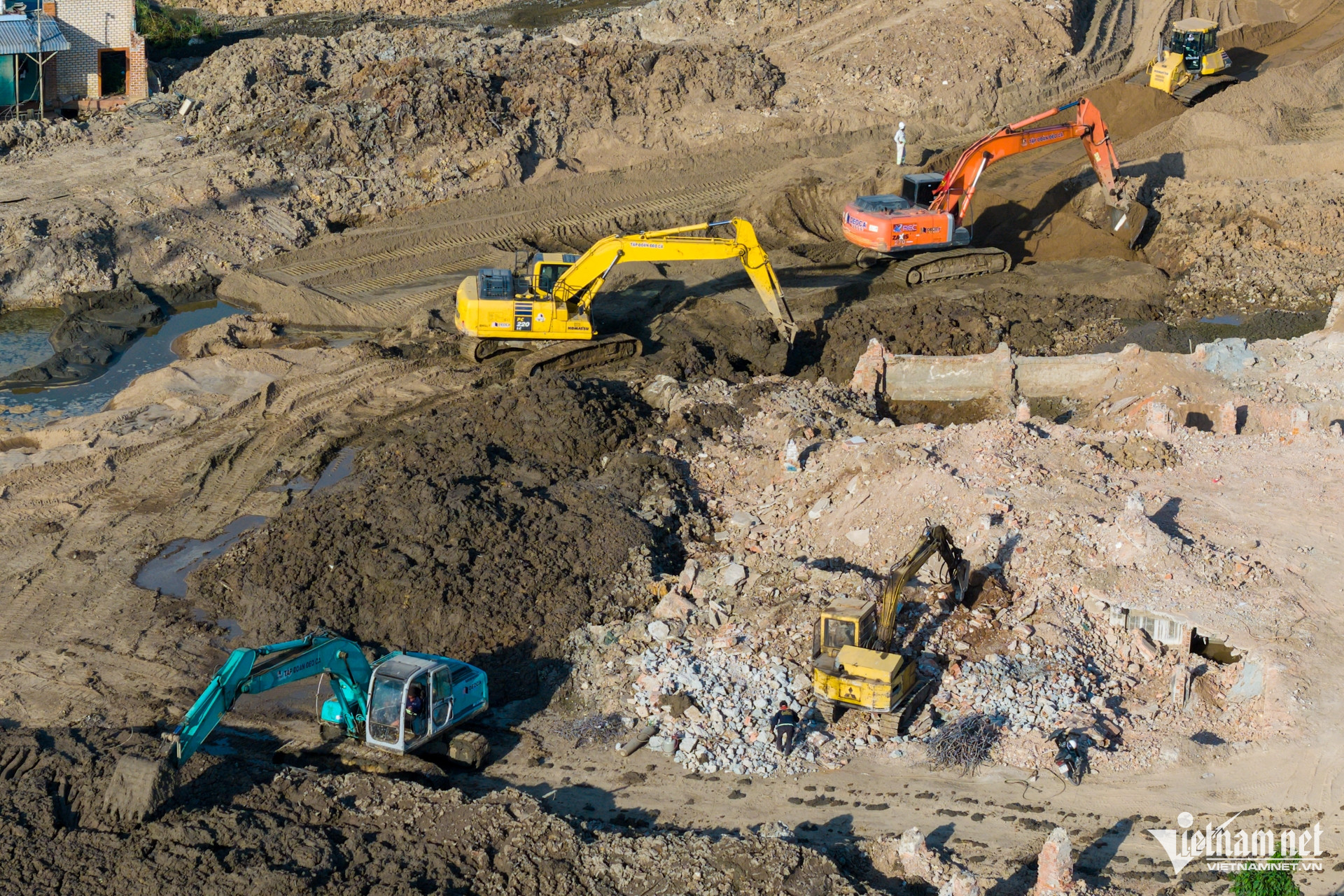 Nhiều công nhân cùng hàng chục máy móc thi công nhộn nhịp trên công trường phía đường ĐT 743A (TP Dĩ An, tỉnh Bình Dương).