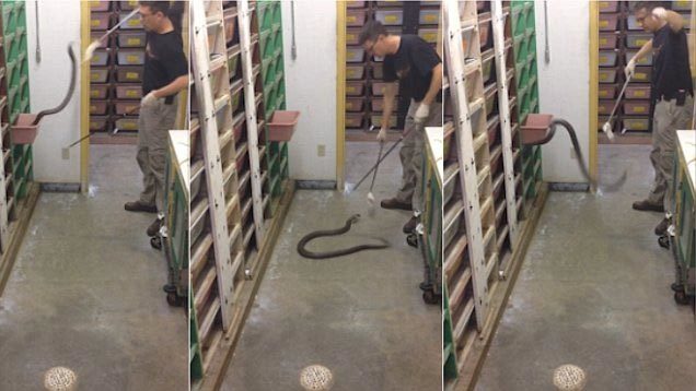 Đoạn clip cho thấy, đa số các con rắn là rắn hổ mang bành đang được cho ăn chuột chết vào bữa trưa. Tuy nhiên, không phải mọi con bò sát này đều tỏ ra vui vẻ với việc bị đánh thức. Một vài con rắn độc đã thình lình lao về phía người cho ăn khi anh mở ngăn kéo nhốt riêng chúng để cho ăn.