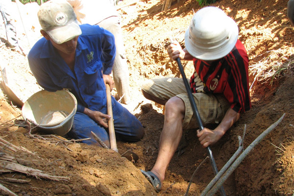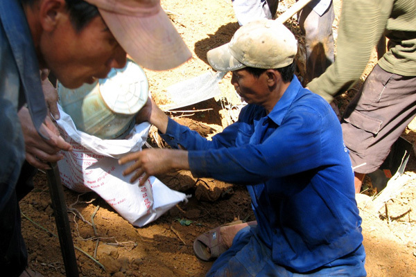 Dùng chân lăn bao đất chứa 'vàng' xuống khe nước.