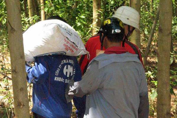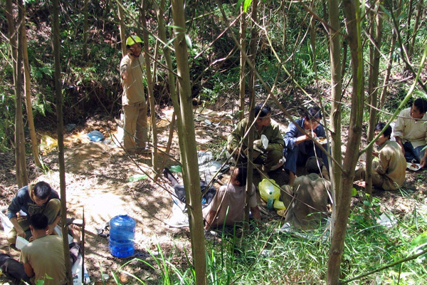 Bị lực lượng chức năng truy đuổi, “vàng tặc” ẩn núp dưới rừng keo.