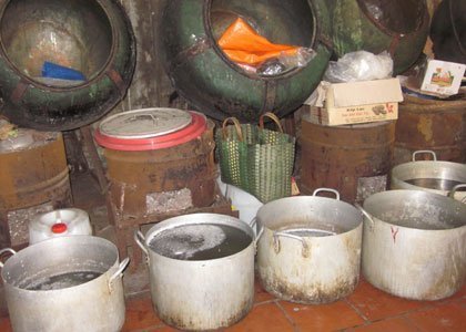 Đặc biệt, ngay gần khu cho bánh vào bao bì, xuất hiện rất nhiều các chum vại, thùng sắt đã han gì, cáu bẩn được xếp chồng lên nhau. Phía bên dưới là khoảng 5 chiếc nồi lớn không có vung đậy, có ruồi đậu xung quanh. Thoạt nhìn qua như các nồi đựng nước thải, nhưng khi quan sát kỹ thì đây không phải là nước hay chất lỏng mà được được nấu thành chất đặc sánh, trên mặt nổi đầy các bọt váng, có màu đục.