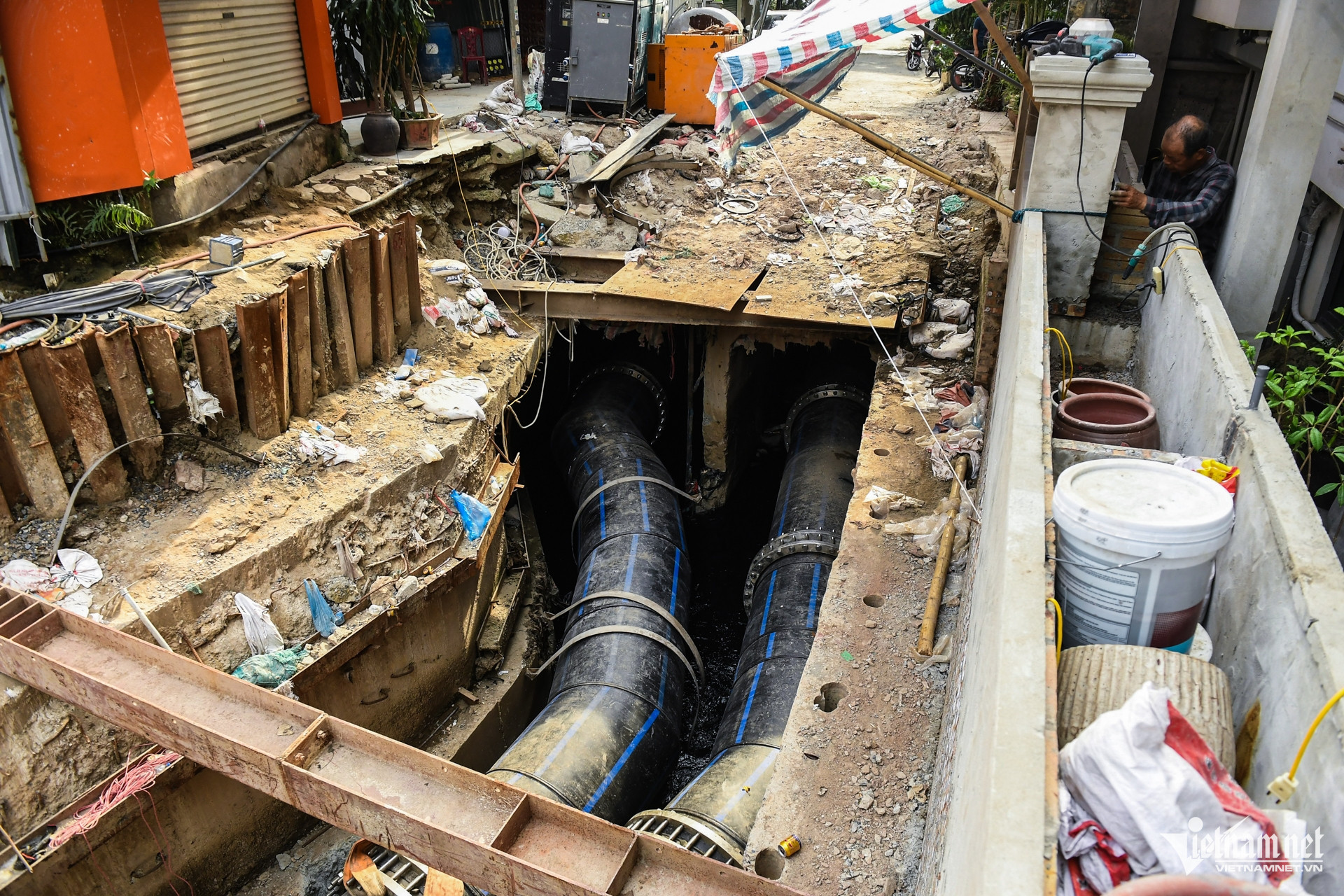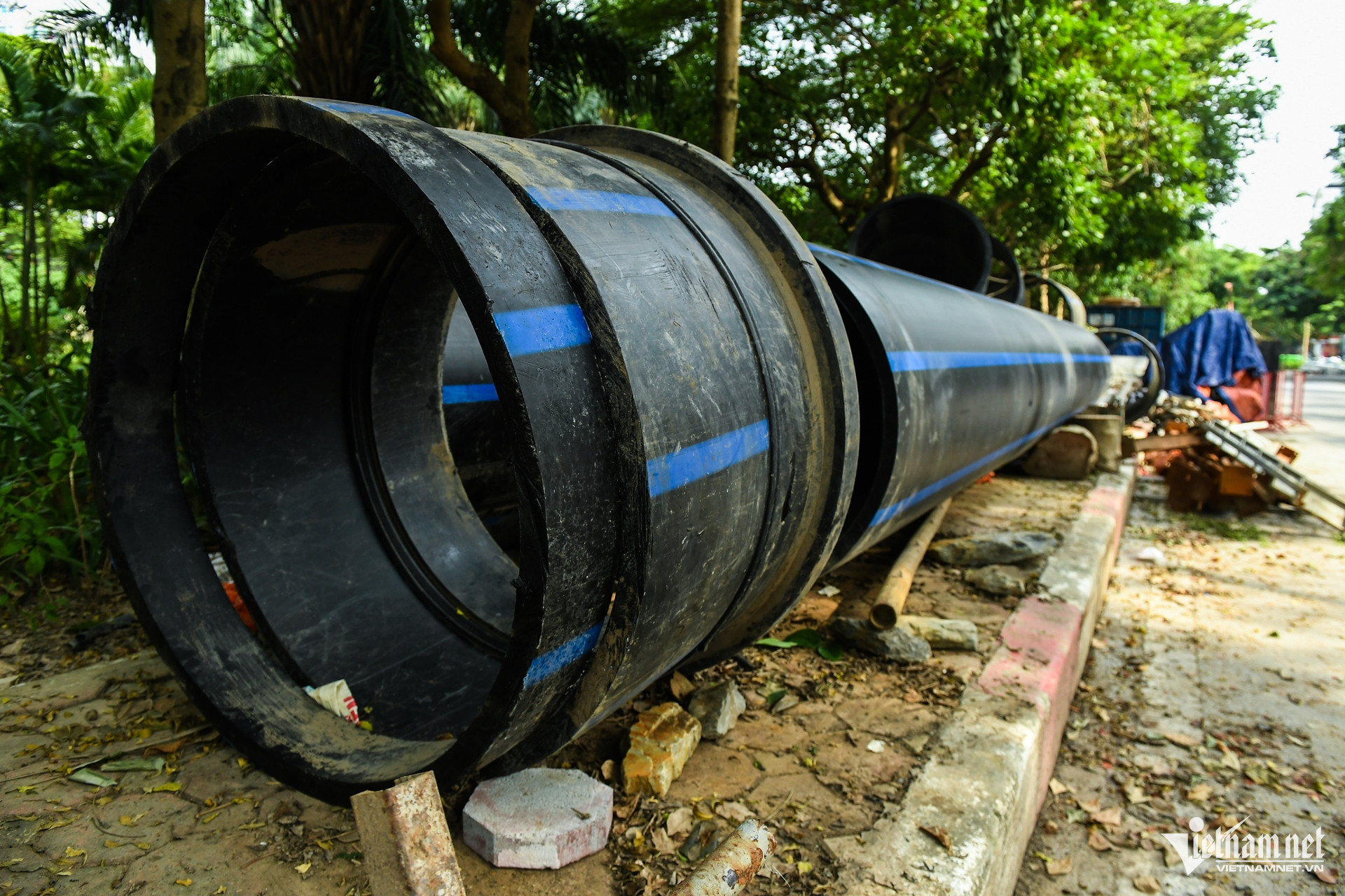 Đường ống ngầm tại khu vực đường Đồng Cổ và ngõ 24 Võ Chí Công đang được quây kín để tiếp tục lắp đặt.