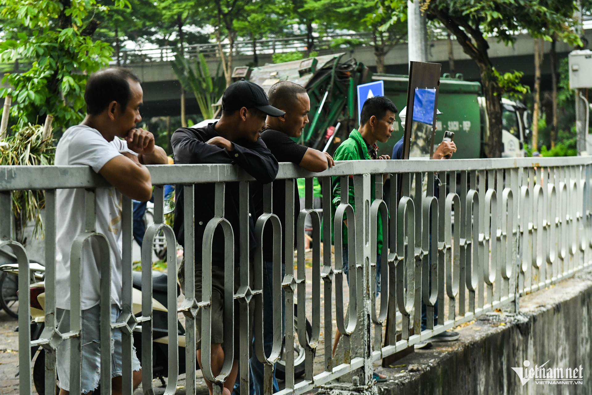 Khá đông người dân đứng quan sát miệng cống dẫn nước vào sông Tô Lịch. Anh Hoàng Dũng sinh sống gần đó, đi ngang qua cũng tạt vào để chụp ảnh. "Mới chiều hôm qua, tôi còn thấy nước sông đen đặc, mở ống nước từ sáng đến giờ mà xanh như vậy cũng yên tâm. Hy vọng công trình sẽ tạo hiệu quả lâu dài", anh nói.
