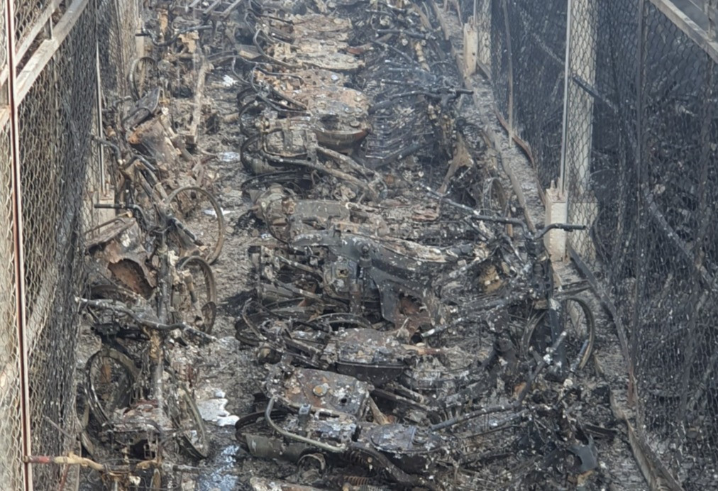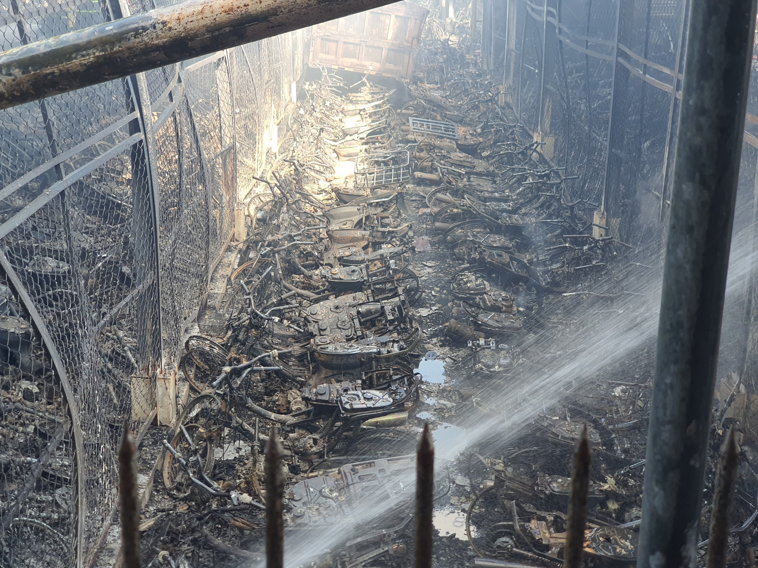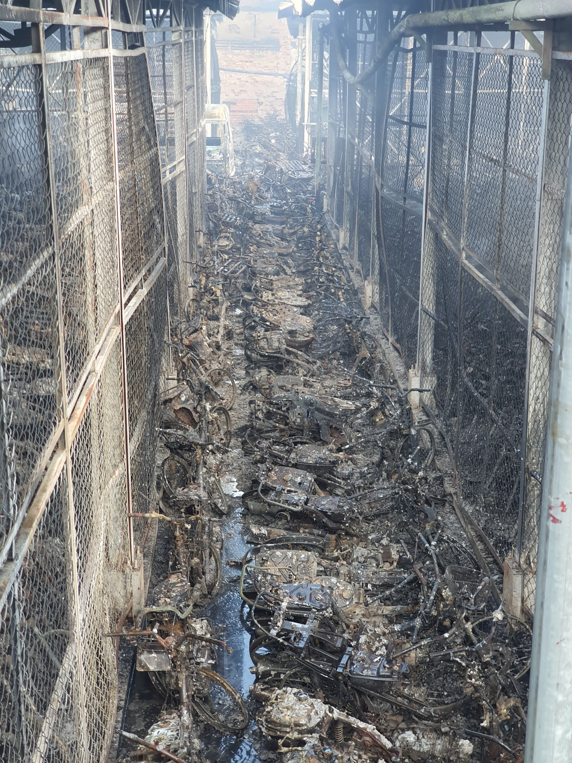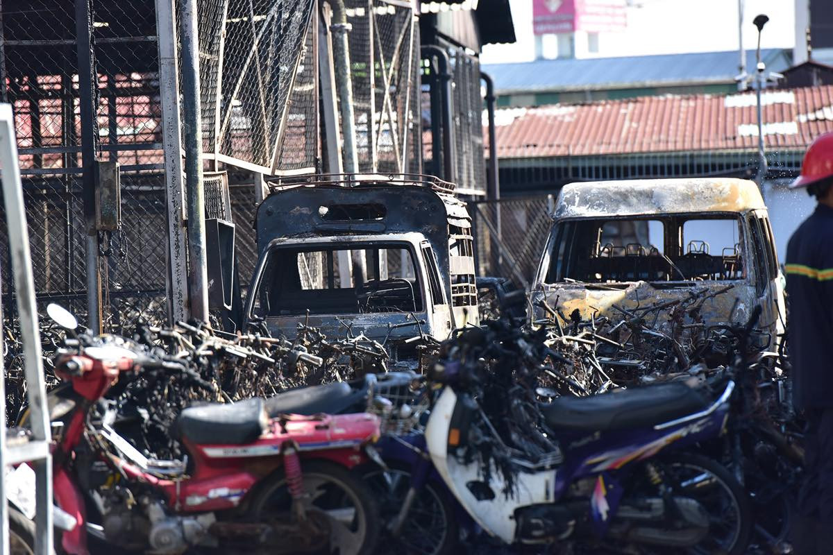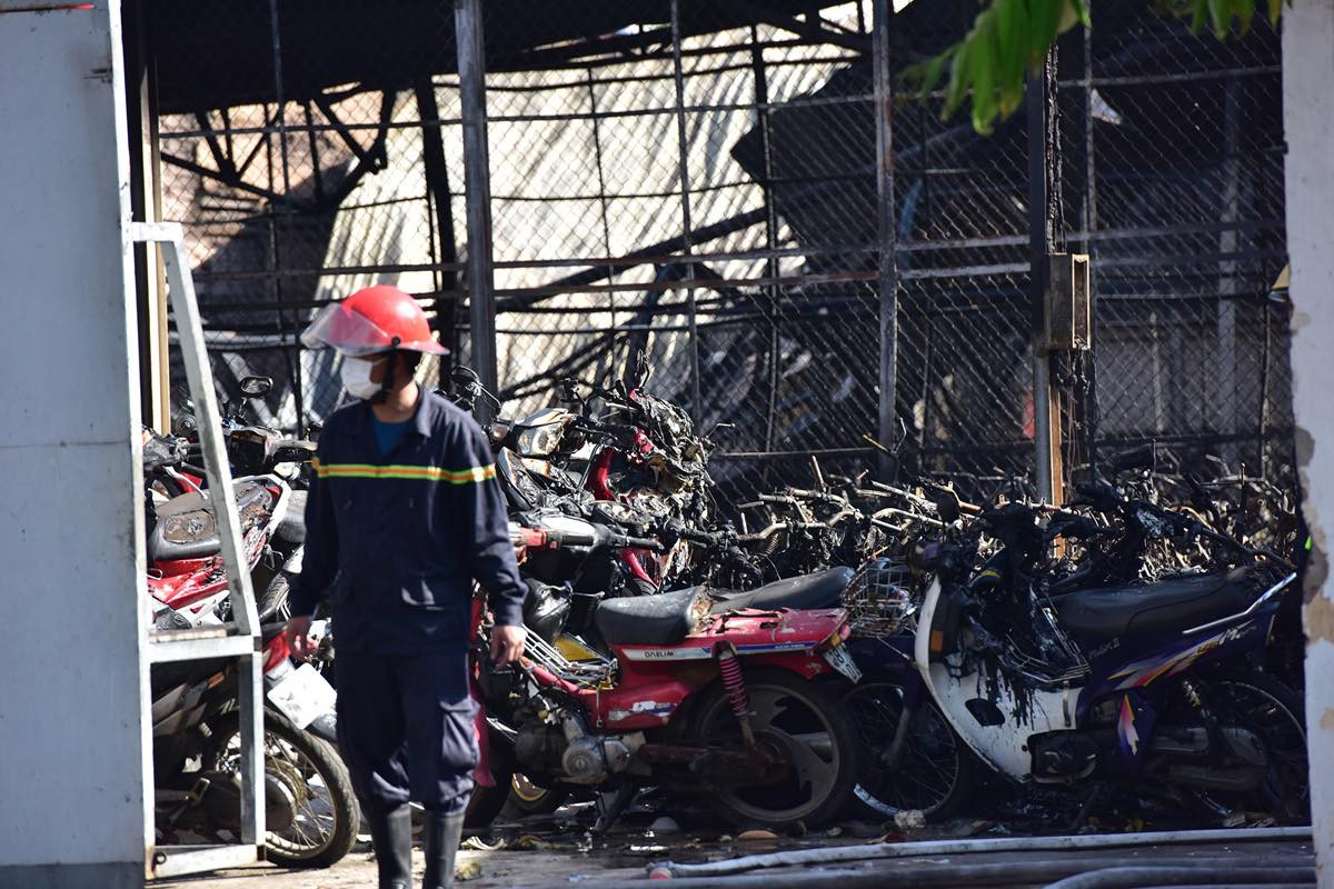 Tại hiện trường, khu vực hỏa hoạn là kho chứa xe tang vật và phương tiện vi phạm giao thông thuộc Phòng CSGT đường bộ - đường sắt (PC08) Công an TP.HCM quản lý có diện tích khoảng 1100m2. Bên trong, hàng trăm xe máy cháy trơ khung, ngã rạp. Các khung nhà che cũng đổ sập vì sức nóng...