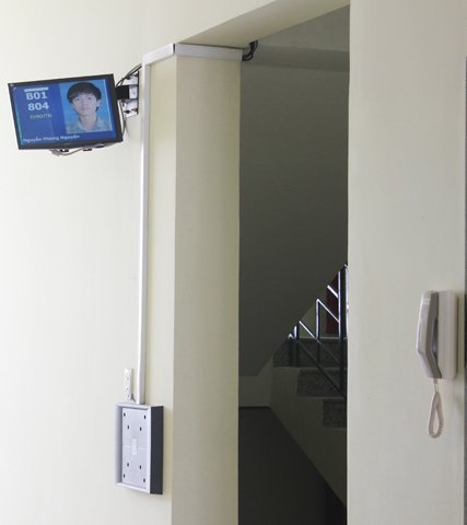 Thiết bị quản lý sinh viên với máy nhận dạng và điện thoại công cộng.