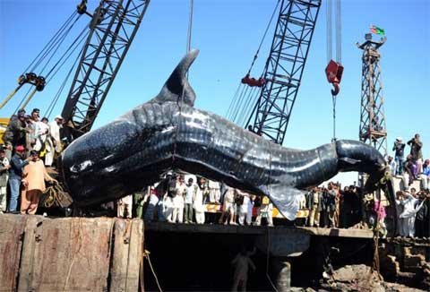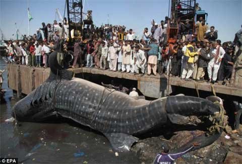 Nhiều người đã đổ xô tới chiêm ngưỡng con cá mập voi, một trong số những con to nhất từng bị bắt, khi nó được đưa khỏi mặt nước tại ngư trường Charai.