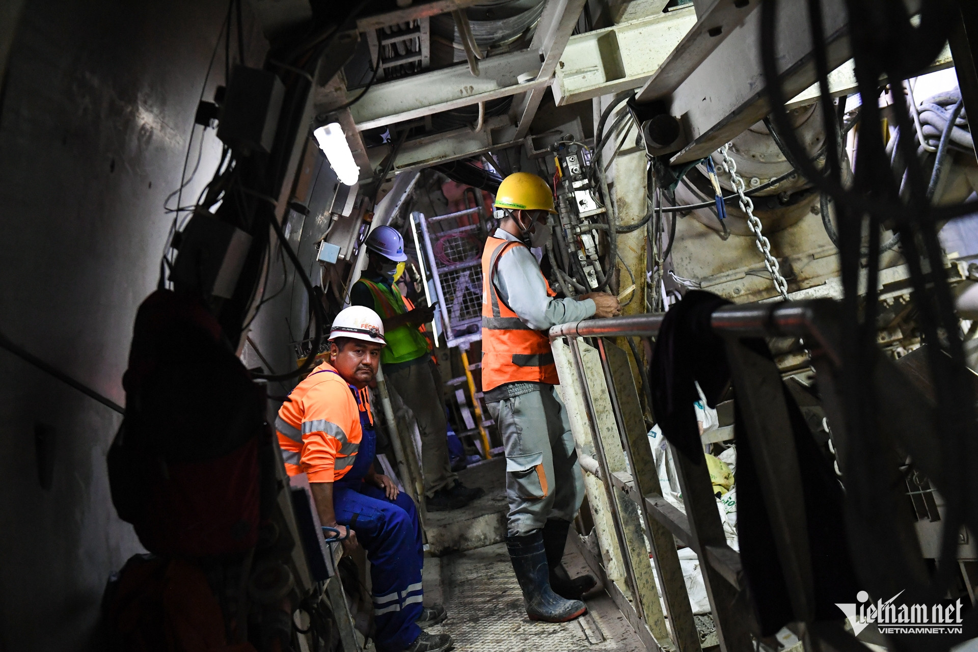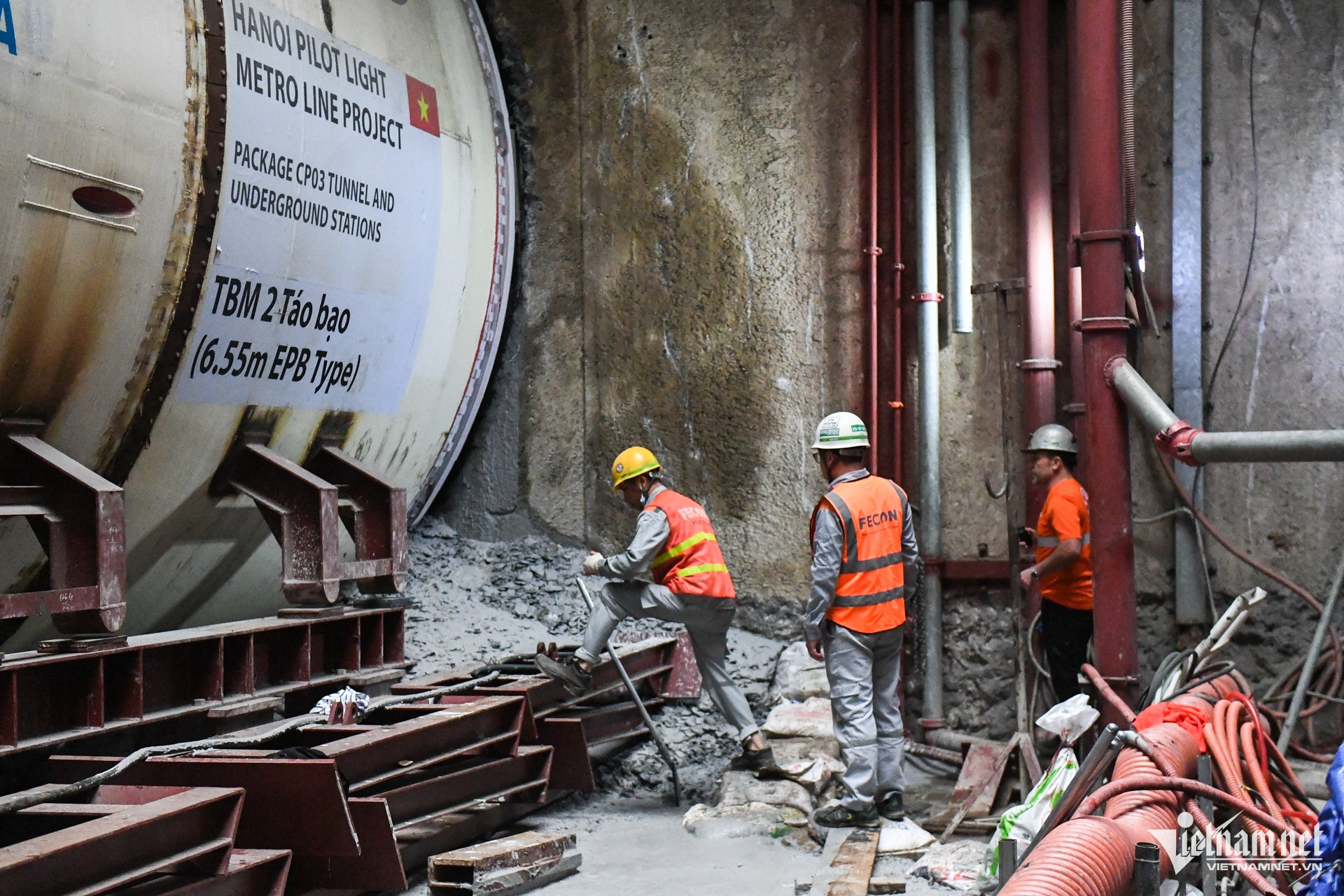 Đội ngũ kỹ thuật vận hành máy đào thứ 2 thuộc tuyến metro Nhổn - ga Hà Nội trao đổi và quan sát những mũi khoan đầu tiên của TBM2. Việc thi công khoan hầm được tiến hành với sự thận trọng và giám sát nghiêm ngặt, bảo đảm an toàn cho các công trình trên mặt đất và tiến độ đề ra.
