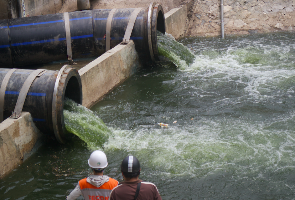 Khi nhìn từ trên cao, mặt nước khu vực này có màu thẫm. Tại các chân cầu bắc ngang sông, rác thải dồn đọng, mặt nước sủi bọt khí.