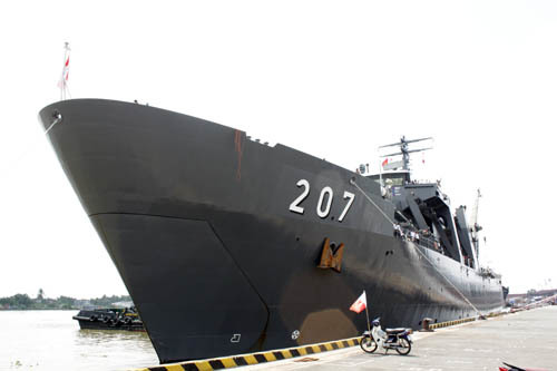 | Tàu RSS Endurance cập cảng Sài Gòn.Ảnh: QĐND |