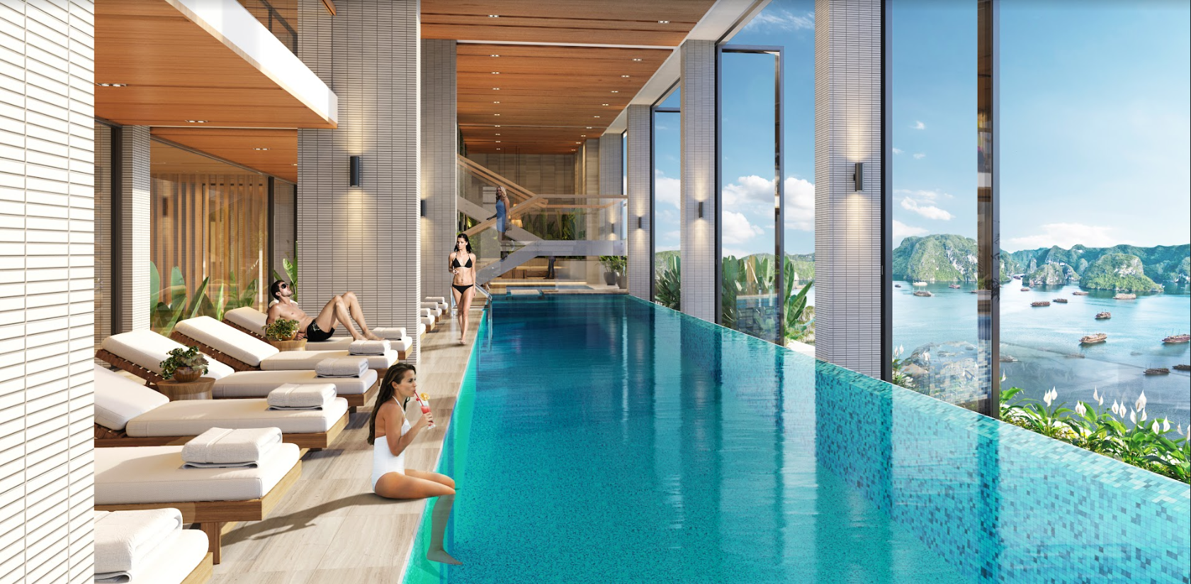 Đơn cử như tại tầng mái, đơn vị thiết kế dành trọn khoảng không cho bể bơi vô cực để cư dân ngắm trọn vịnh biển và thành phố Hạ Long. Cũng trên tầm cao, cây cầu kính lãng mạn kết nối với khu vườn Hàn Quốc trở thành điểm check - in đầy lý tưởng. Dưới chân toà tháp tập trung các tiện ích như thư viện, khu vui chơi, sân tập thể dục…