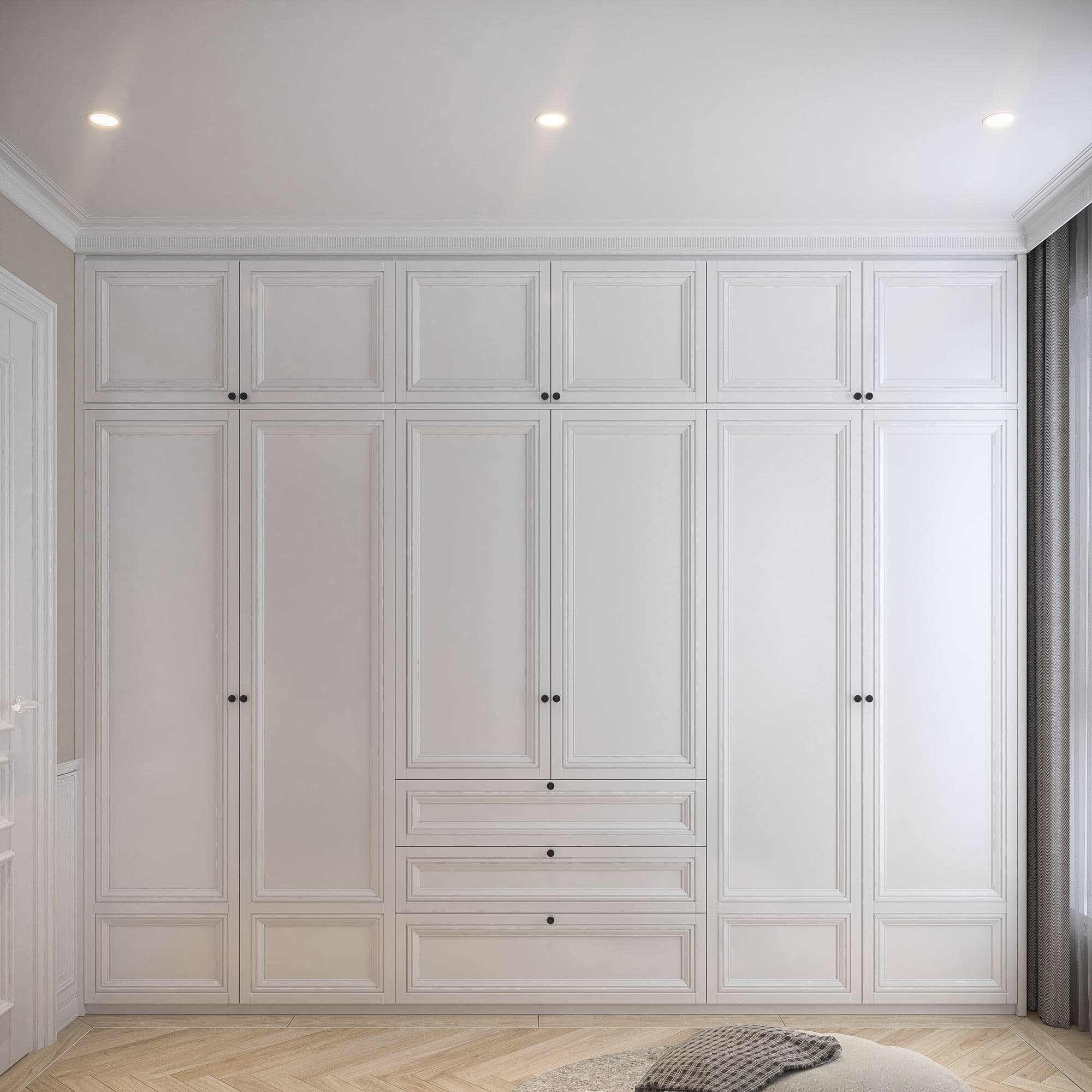 Phòng ngủ master chia làm hai không gian, 1 bên là nơi ngủ và 1 bên là phòng thay đồ, làm việc và đọc sách. Tủ quần áo với gương kính hiện đại đối diện là tủ lớn hơn, thiết kế kiểu cổ điển.
