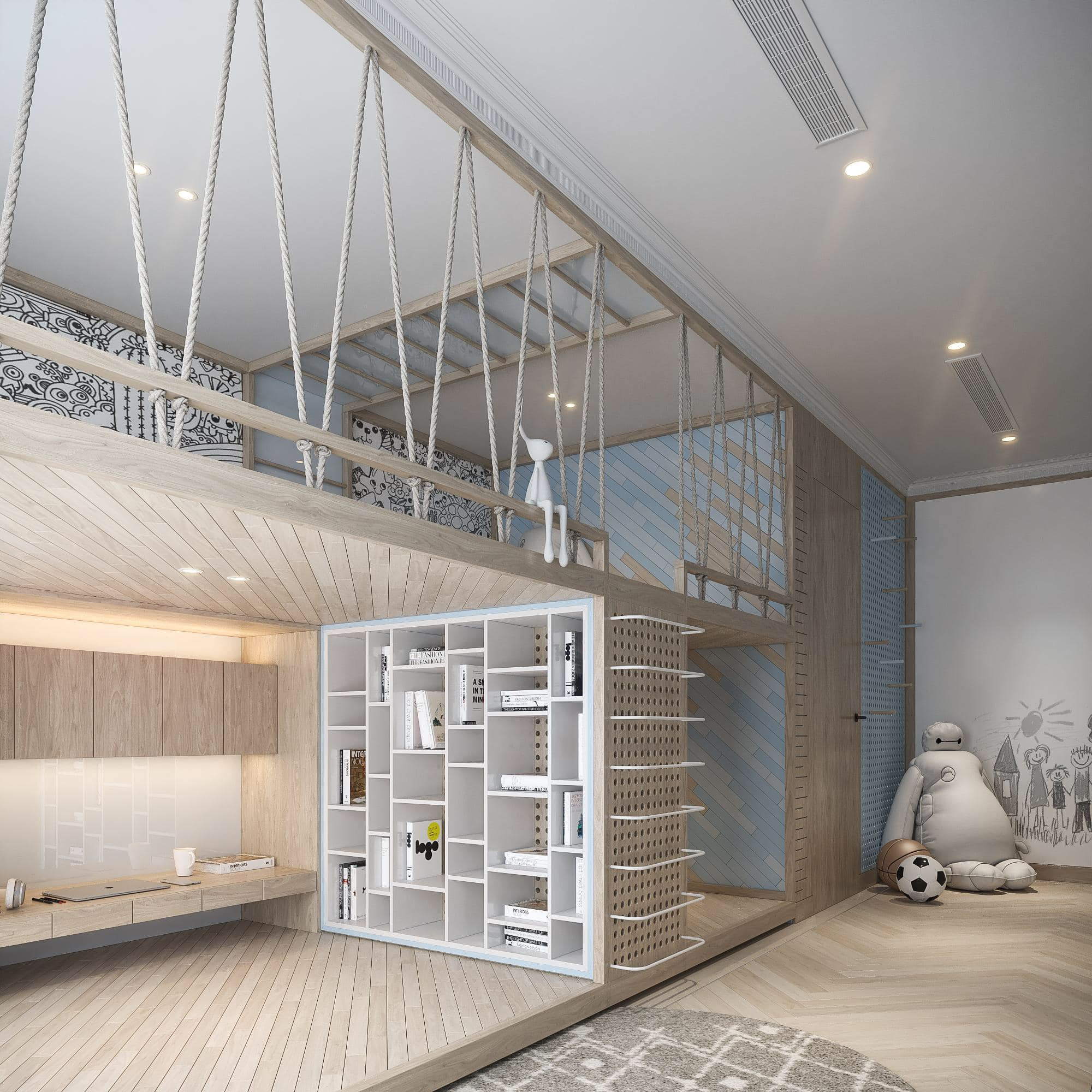 Phòng ngủ cho hai bé rộng rãi, chia thành hai buồng mini. Mỗi bé có 1 giường ngủ treo và 1 không gian để đồ, học tập phía dưới. Màu sắc ở đây trầm nhưng không mất đi vẻ năng động, cá tính, phù hợp lứa tuổi các bé.