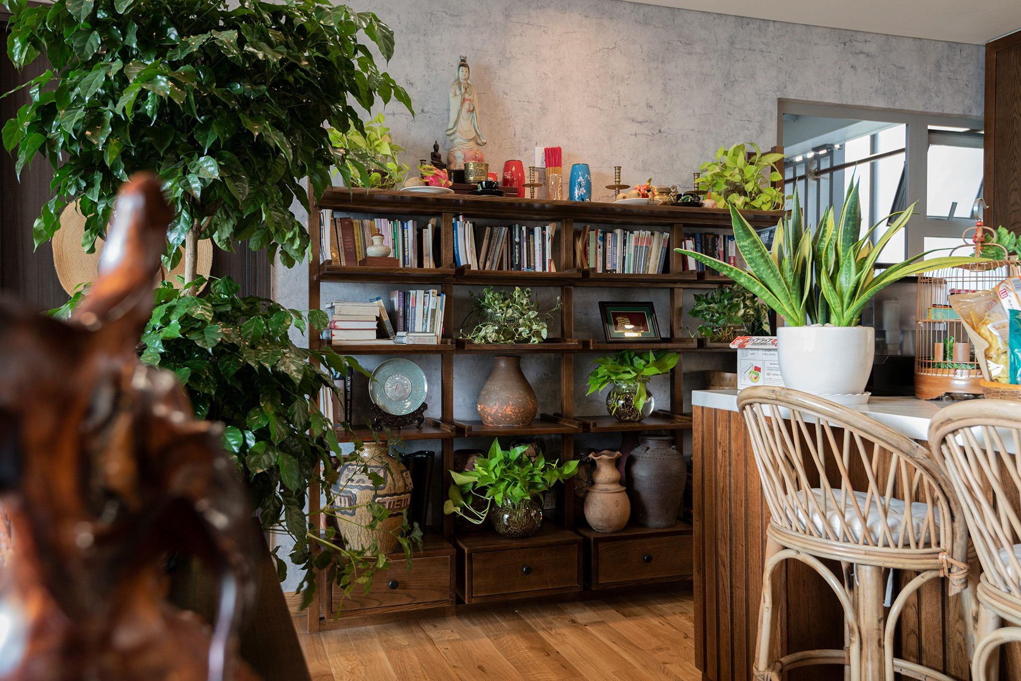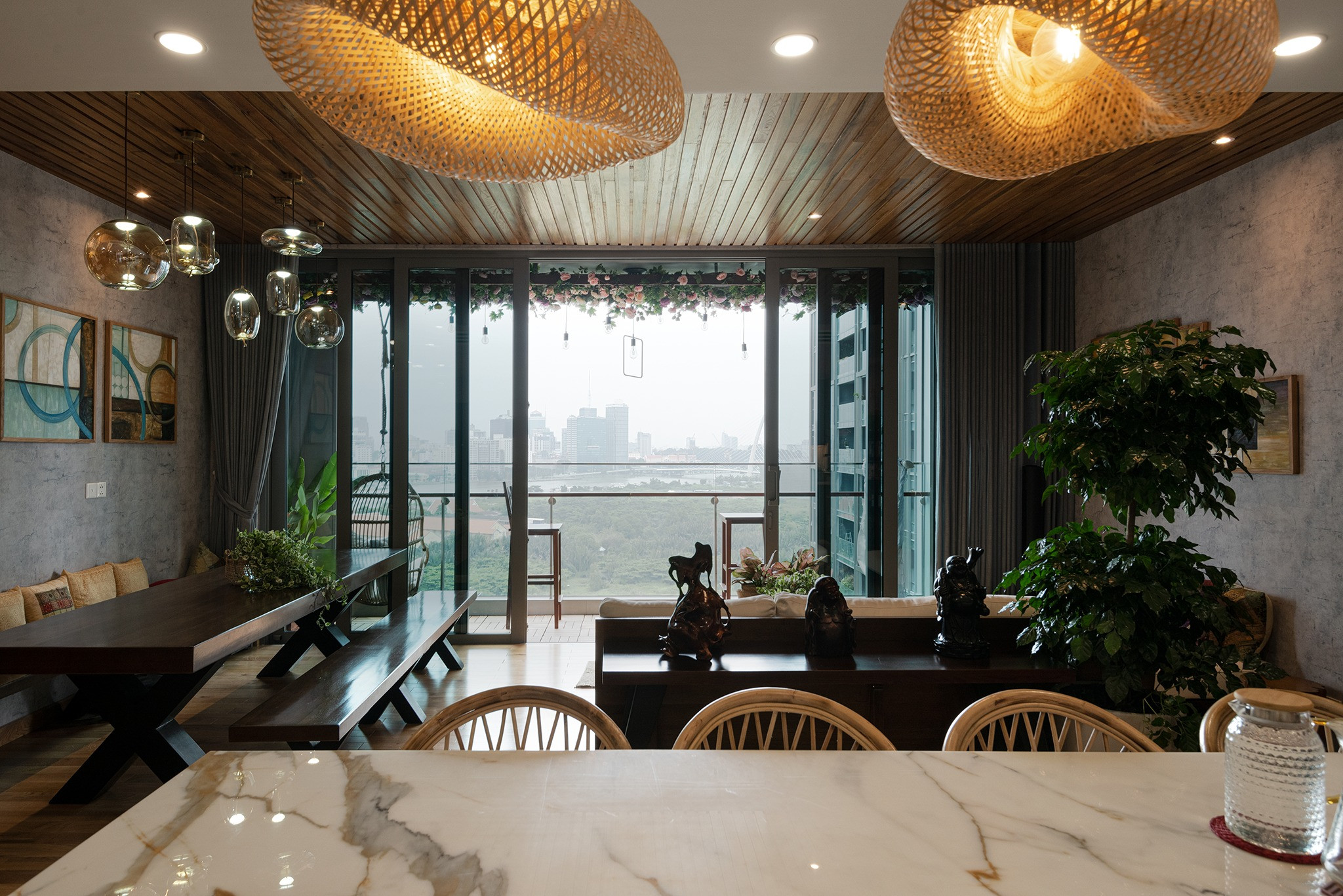Nhóm kiến trúc sư thi công nội thất và gia chủ muốn tạo ra một không gian đẹp tĩnh lặng, nên chị chọn những bức tranh mang màu sắc thiền, màu sắc và kiểu dáng của nội thất cũng theo tông màu trầm ấm.