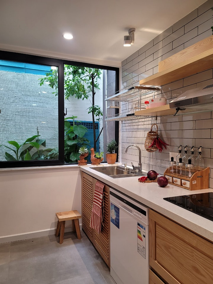 Khu bếp được chừa một diện tích nhỏ làm giếng trời và sân vườn sau nên không gian rất thông thoáng. Bộ bàn ăn tròn giúp tiết kiệm diện tích nhà, đồng thời tạo điểm nhấn và ngăn cách bếp với phòng khách.