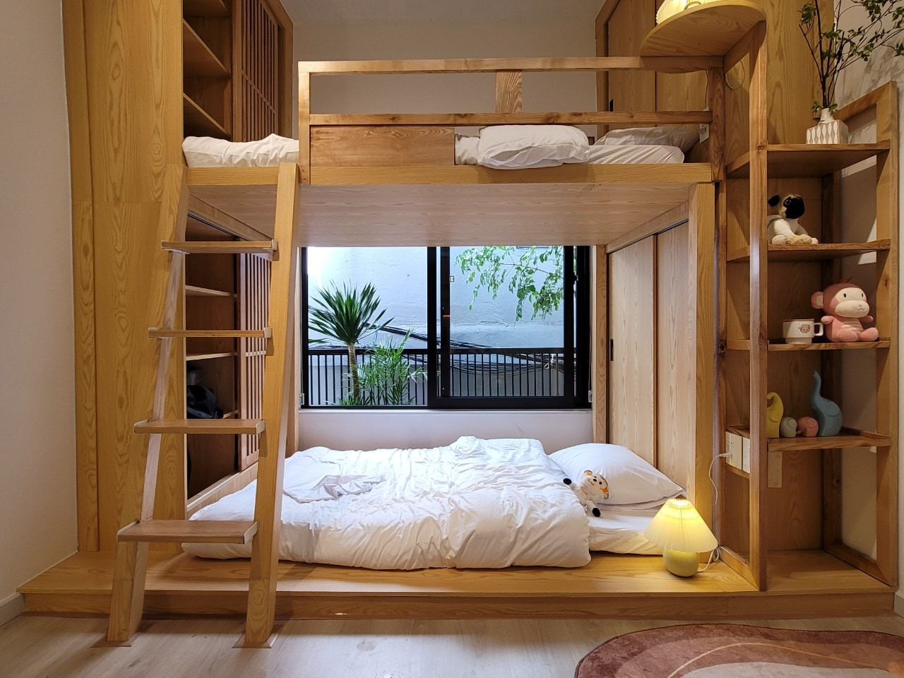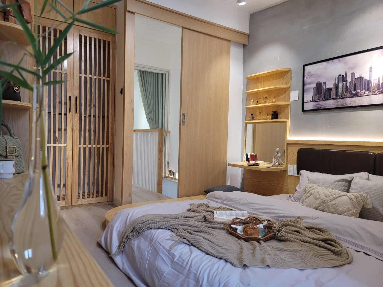 Phòng ngủ master dùng hệ giường phản kiểu Nhật. Cửa ra vào là hệ lam gỗ nhẹ nhàng.