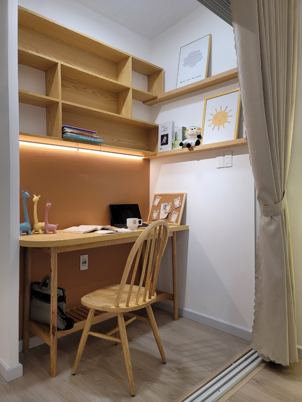 Bàn học của các con, khi kéo cửa kính lại sẽ là khu riêng biệt nhưng kéo ra sẽ tạo thành không gian mở. Đây cũng là cách xử lý góc chết trong nhà, tận dụng tối đa diện tích của gia chủ.