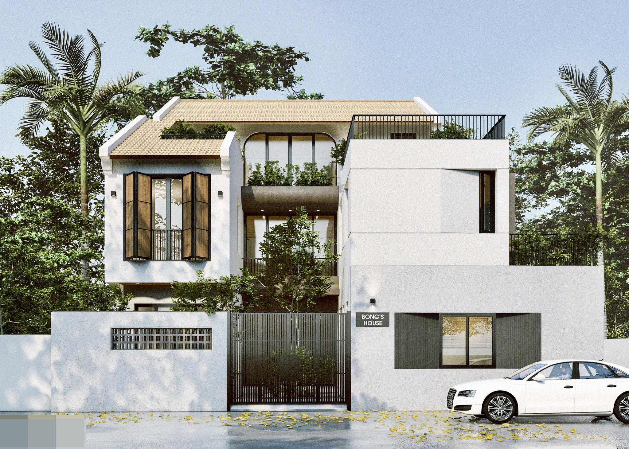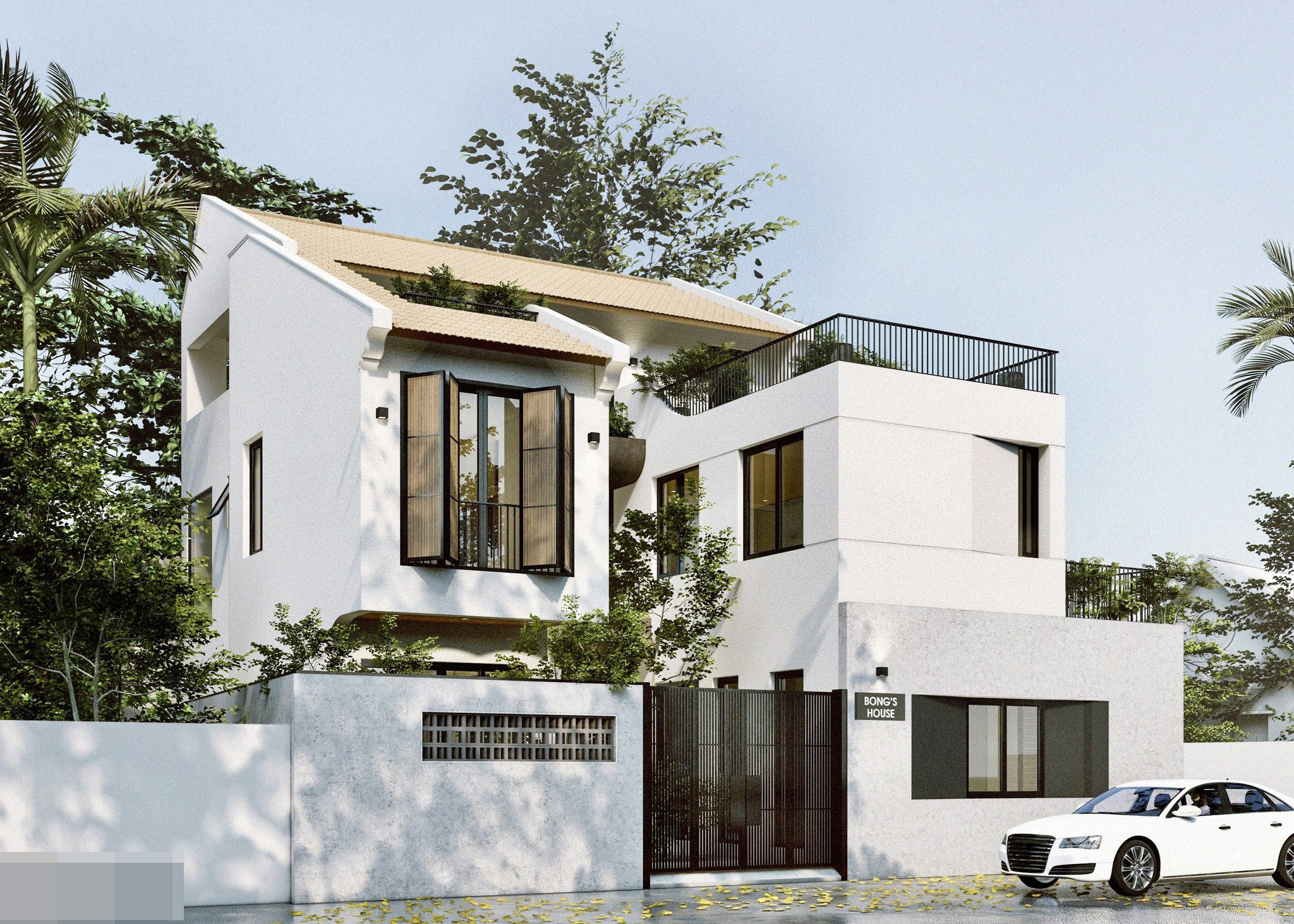 Ngôi nhà 4 mặt thoáng mang sắc trắng nổi bật, thiết kế mái dốc truyền thống nhưng cũng đan xen những bố cục hiện đại.