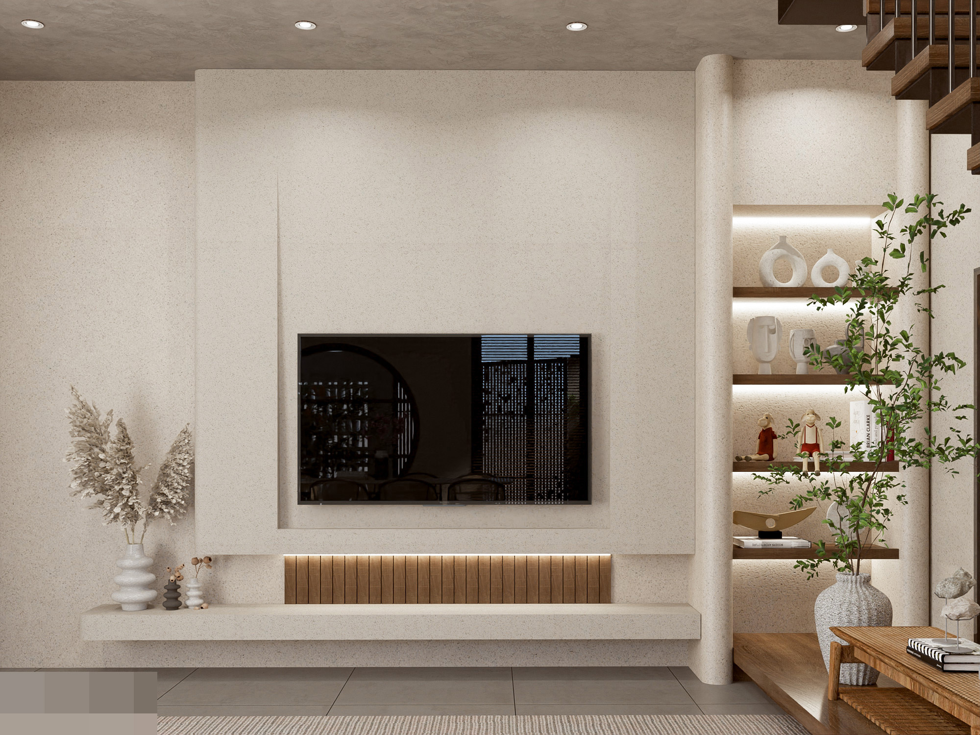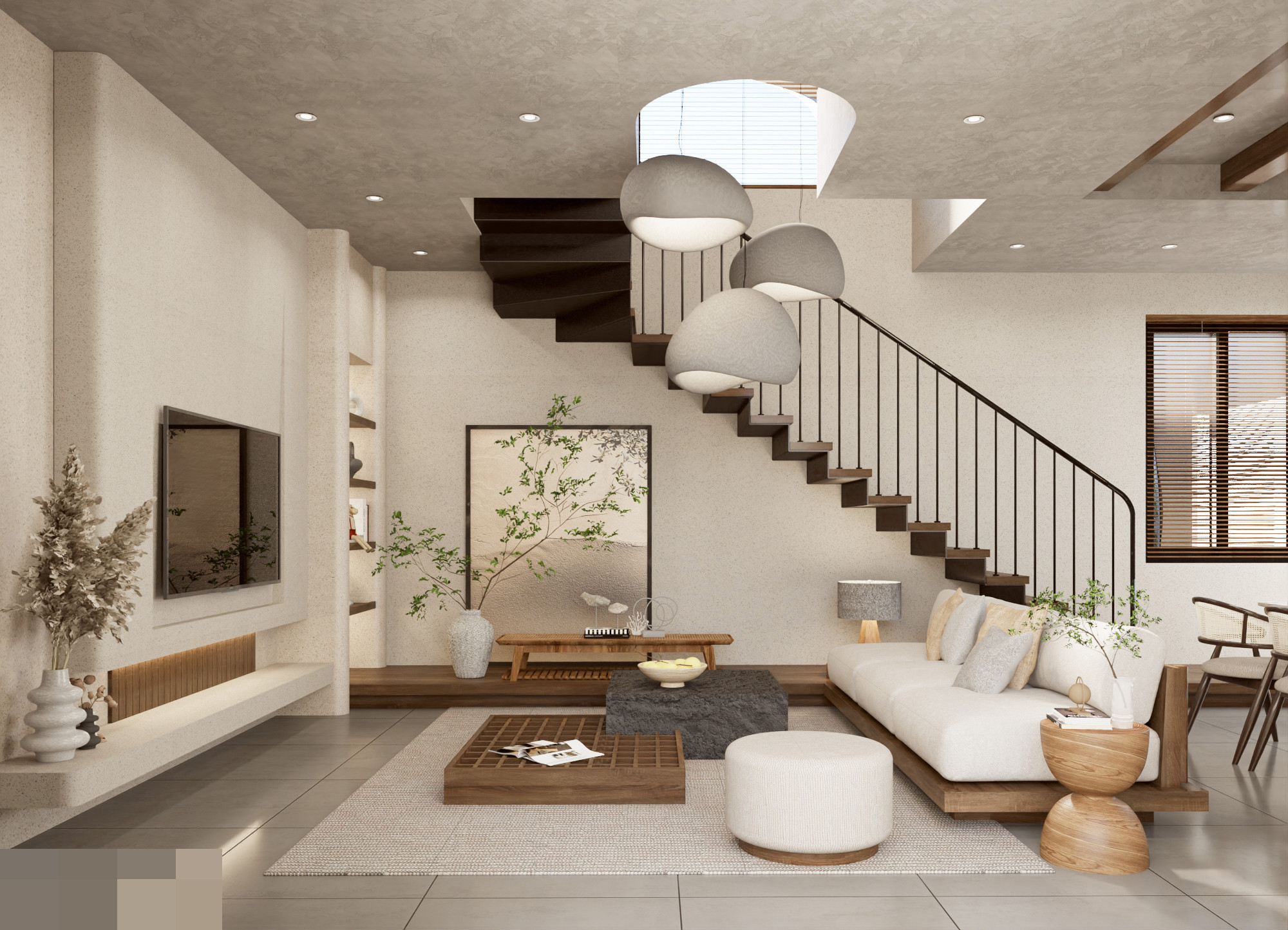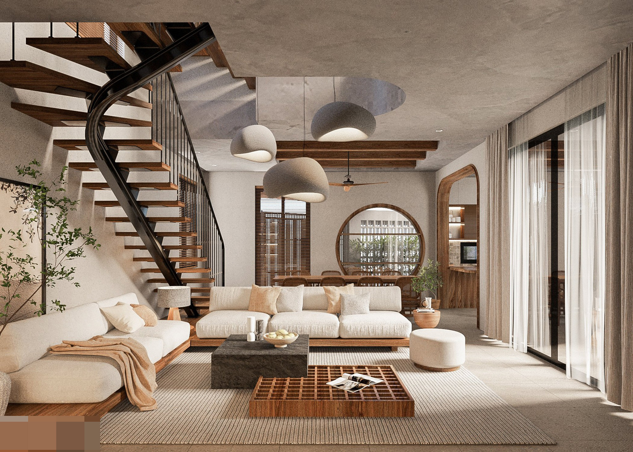 Khu vực phòng khách mang chút phong cách Nhật. Bộ sofa gỗ màu trắng đồng điệu với tường và rèm. Phần xương gỗ chắc chắn, màu nâu vàng nổi bật. Bàn trà chữ nhật nối với khối gỗ to tạo điểm nhấn. Cầu thang dẫn lên tầng 2 bằng sắt sơn tĩnh điện tạo độ thoáng cho nhà. Cửa sổ nhìn ra vườn dùng hình tròn tạo nét đẹp cổ điển. Bếp và bàn ăn cạnh phòng khách tạo sự liên kết xuyên suốt.