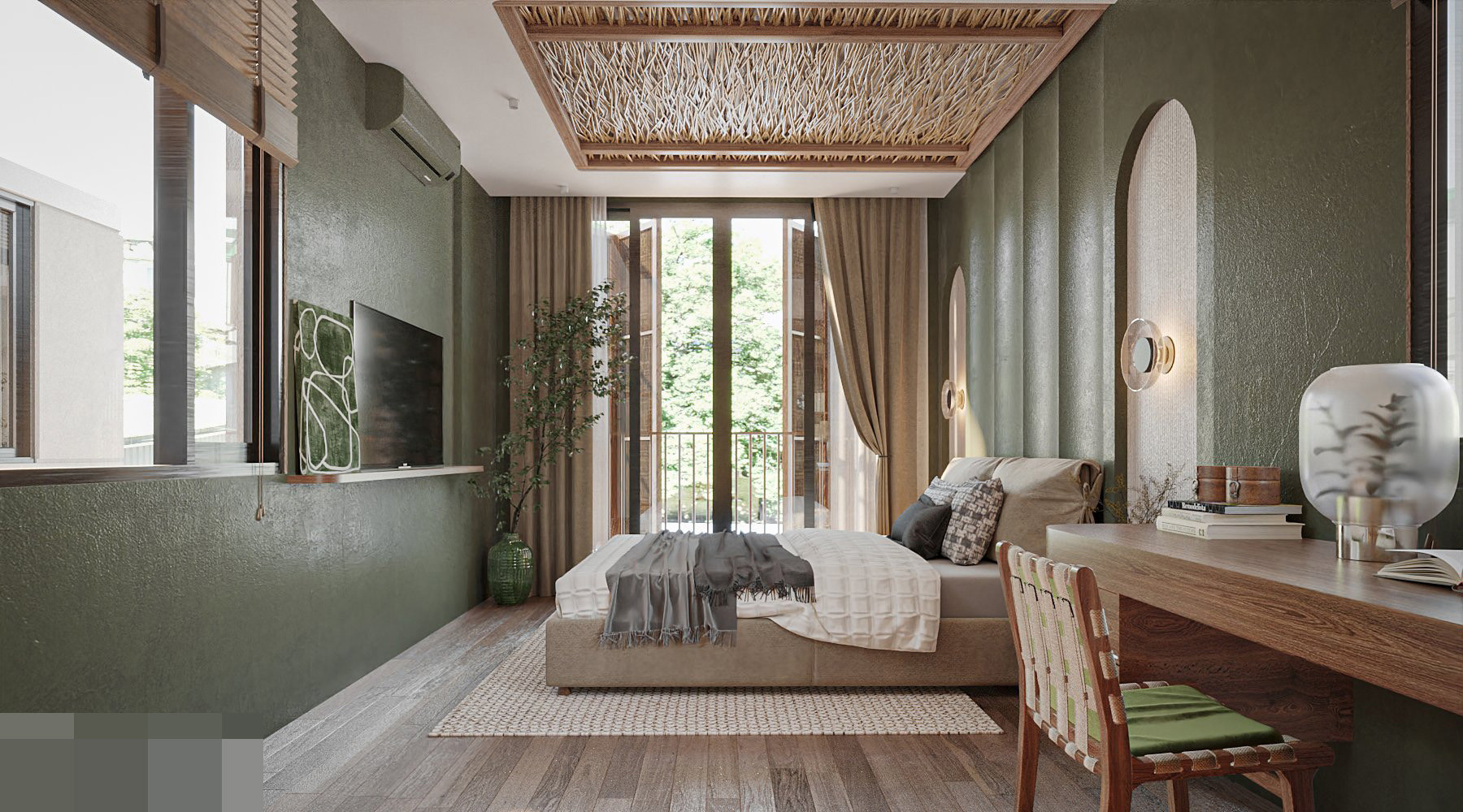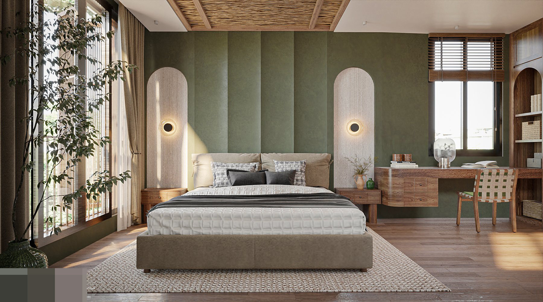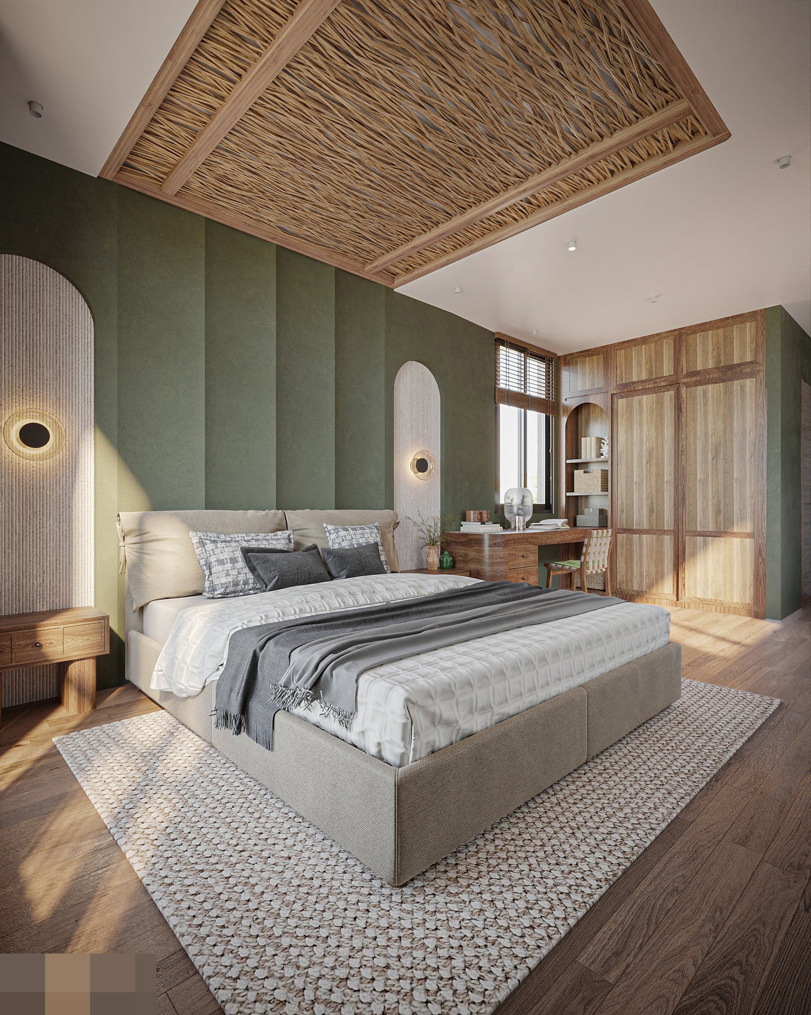Phòng ngủ master màu xanh lá mát dịu, nhiều cửa sổ. Nội thất giản tiện nhằm tạo độ thoáng cho không gian nghỉ ngơi, gia chủ dễ đi vào giấc ngủ ngon.