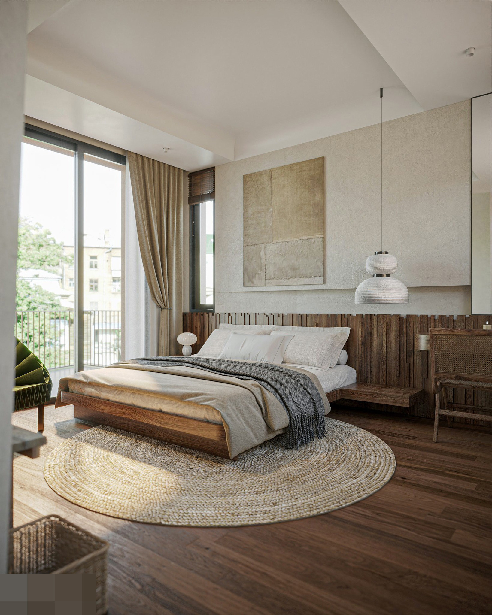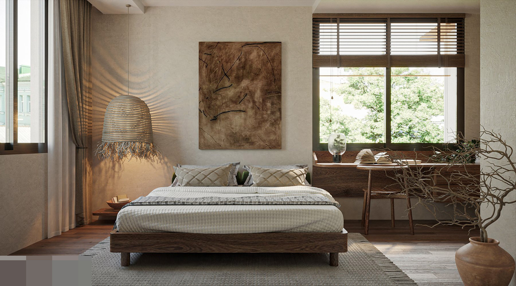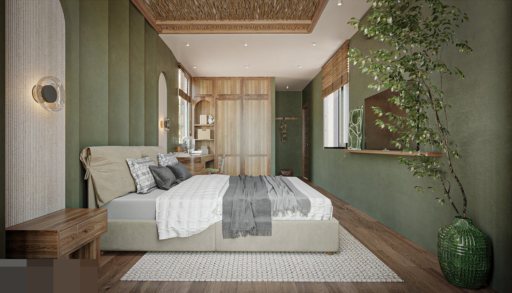 Phòng ngủ master màu xanh lá mát dịu, nhiều cửa sổ. Nội thất giản tiện nhằm tạo độ thoáng cho không gian nghỉ ngơi, gia chủ dễ đi vào giấc ngủ ngon.