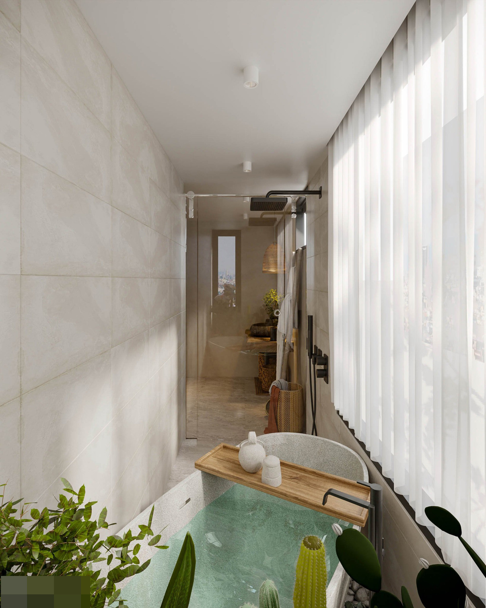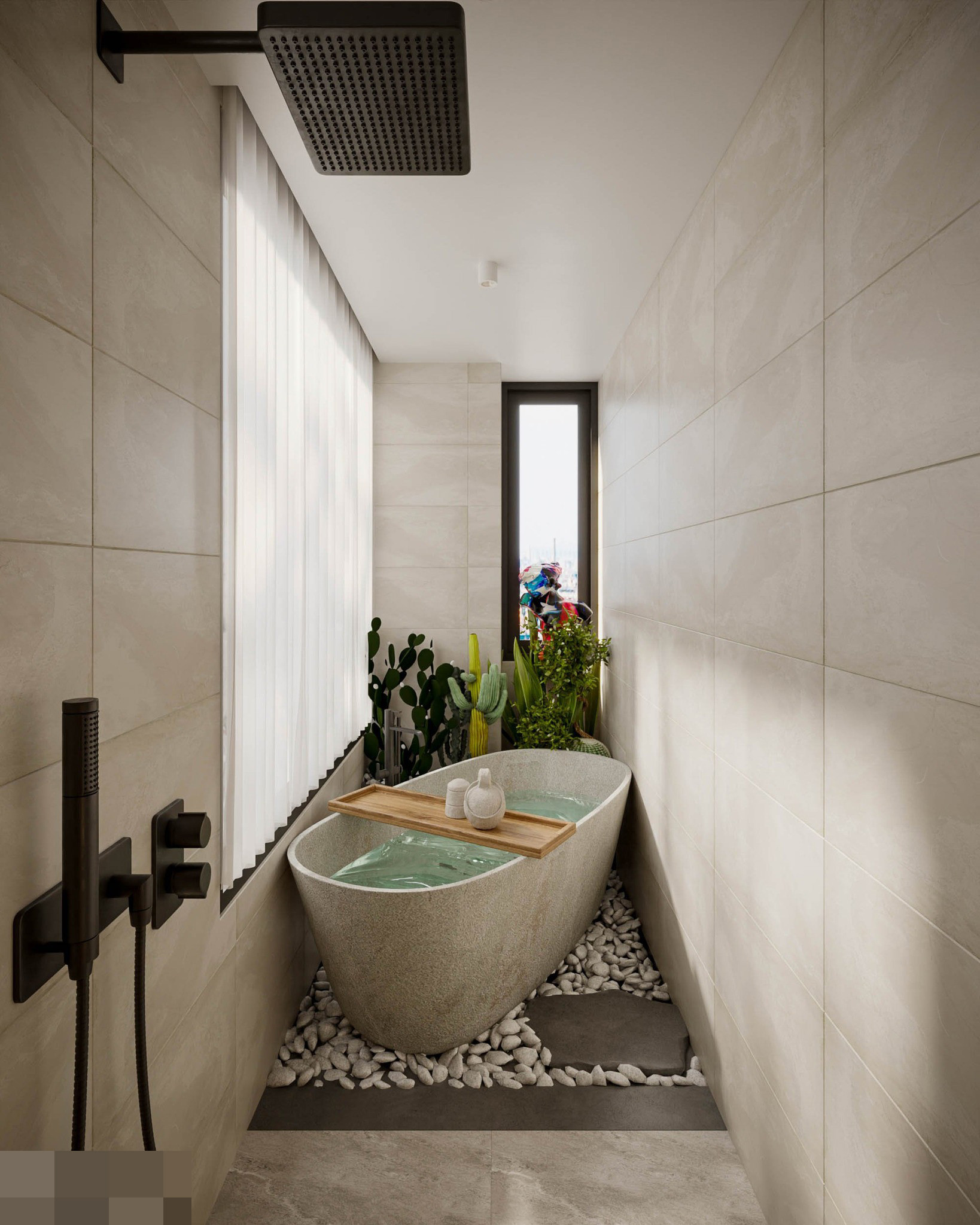 Phòng tắm có khe hẹp nhưng nhóm thiết kế vẫn cố gắng bố trí nơi xanh mát, nhiều ánh sáng để các thành viên tận hưởng cảm giác như ở khách sạn 5 sao. Bồn tắm bê-tông dẻo đặt lệch, dưới trải sỏi mát-xa dễ chịu. "Đôi khi sự không cân xứng lại tạo ra vẻ đẹp mới lạ cho công trình, như chiếc bồn tắm này, nếu đặt thẳng, vừa khó có chỗ bước vào lại bí bách. Chỉ cần đặt lệch là có góc rất thú vị, nghệ thuật", nam kiến trúc sư nói.