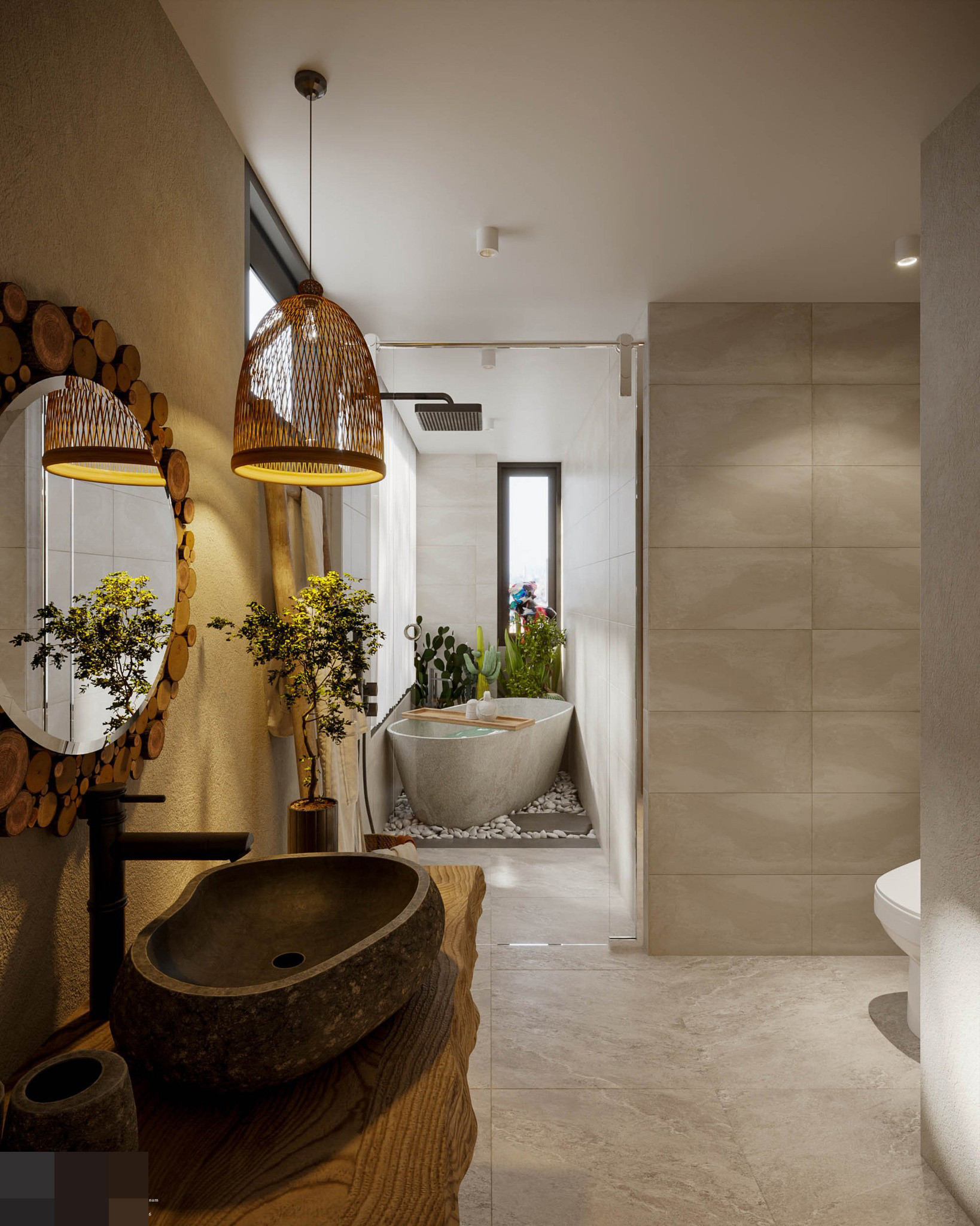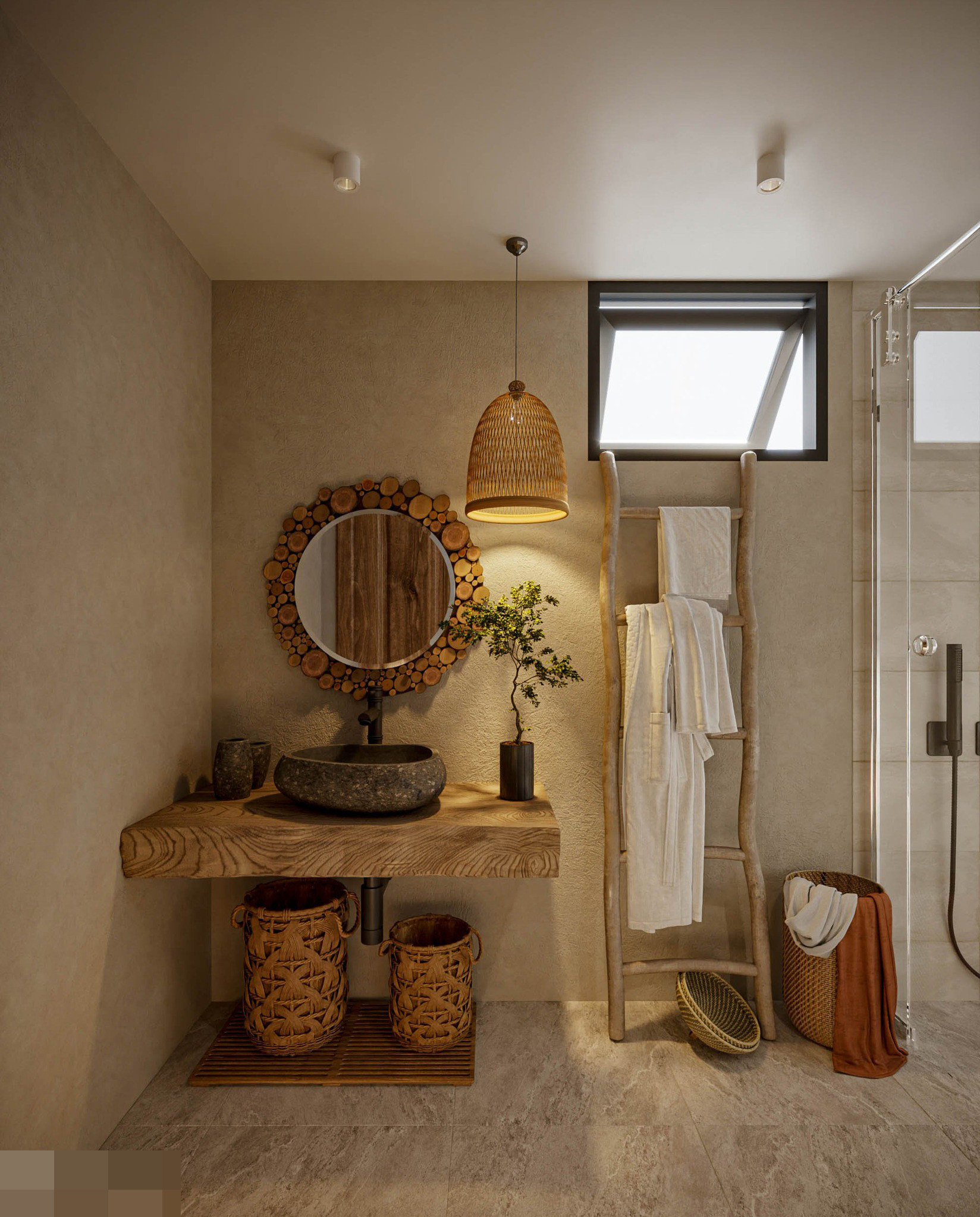 Khu rửa mặt khô dùng bồn đá mài, giỏ mây tre đan và thang treo đồ bằng gỗ mộc. Ánh đèn thả trần mang đến vẻ ấm cúng cho không gian.