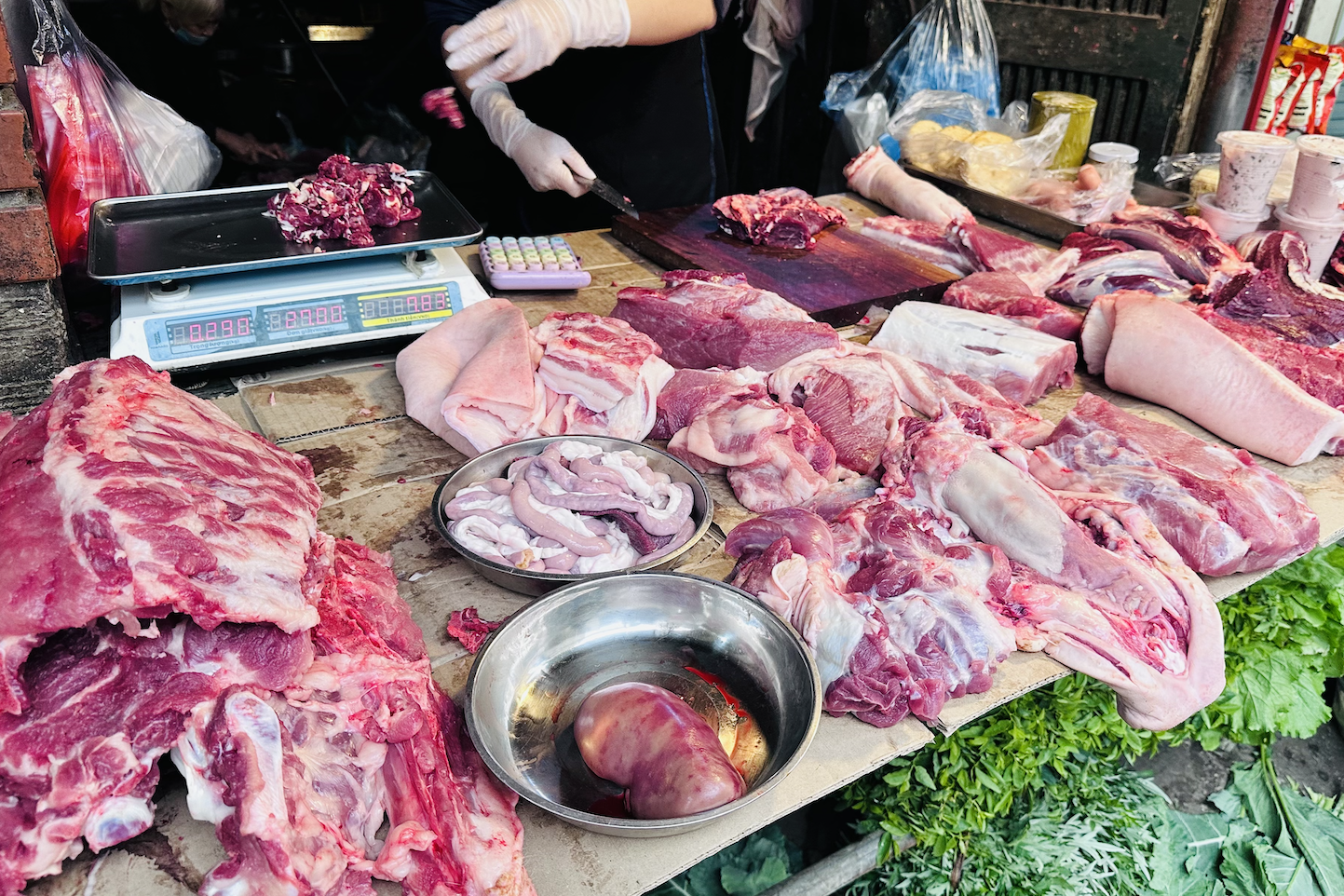 Tương tự, tại chợ Đại Từ (Định Công, Hà Nội), thịt mông sấn, vai sấn, chân giò rút xương giá từ 140.000-150.000 đồng/kg; giá thịt ba chỉ, nạc thăn là 160.000 đồng/kg, sườn thăn 180.000 đồng/kg...