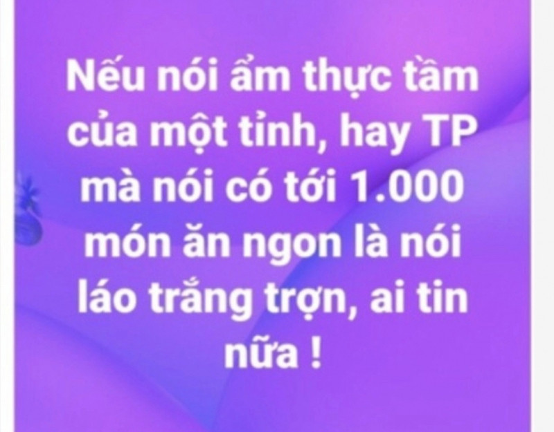 Chia sẻ với báo chí, ông Nguyễn Thanh Hoàng cho biết, hôm 5/11, ông đăng trên Facebook cá nhân nội dung: “Nếu nói ẩm thực tầm của một tỉnh, hay TP mà có tới 1.000 món ăn ngon là nói láo trắng trợn, ai tin nữa”.