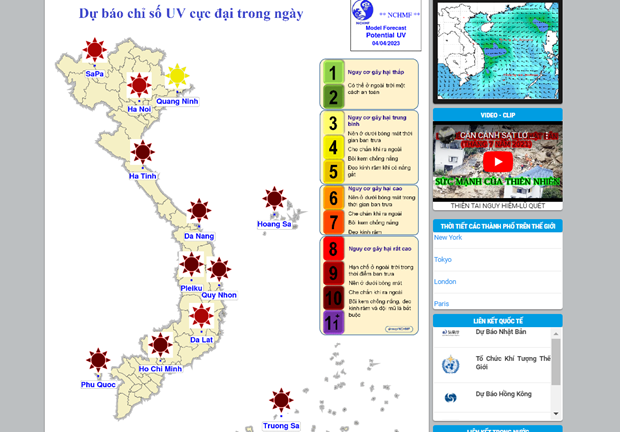 Riêng thành phố Nha Trang và Cần Thơ, chỉ số tia UV cực đại, dự báo sẽ lên tới mức 10,6-10,7 vào lúc 12h; đây là mức “cảnh báo tím,” rất nguy hiểm.
