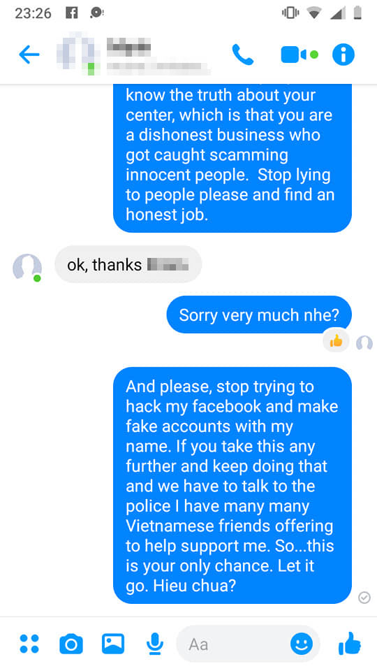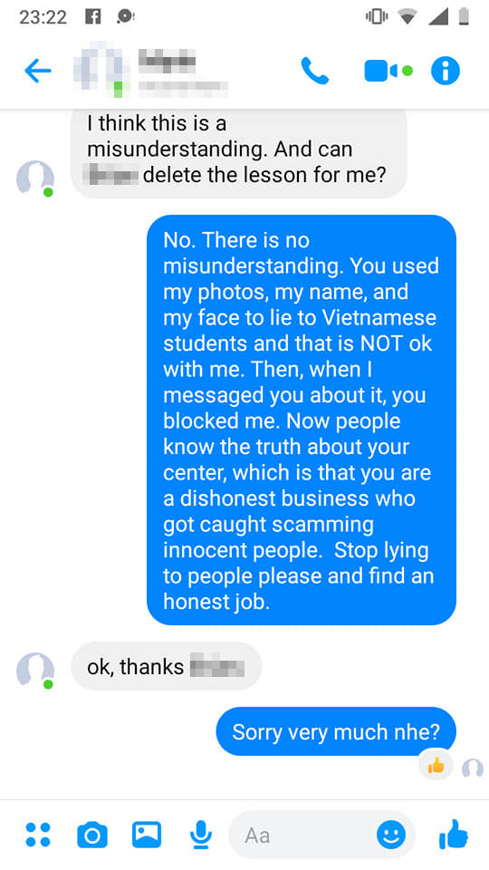Sau khi phát hiện hình ảnh của mình bị sử dụng trái phép nhằm mục đích lừa đảo, thầy B. B đã nhắn tin cho trung tâm này. Tuy nhiên chẳng những không được phản hồi mà còn bị block. Trang dạy tiếng Anh miễn phí lấy tên của thầy sau đó cũng đã bị xóa. "Tôi không hề muốn nhận được bất kỳ khoản tiền nào từ việc này và thành thật mà nói, tôi sẽ không chia sẻ thông tin nếu tôi không cảm thấy có lỗi với những người đang bị họ lừa dối. Tôi chỉ mong những người nhìn thấy những thông tin này viết rằng tôi không hề làm việc ở đây và họ đang bịa đặt về tôi và còn sử dụng thông tin của tôi", thầy B.B viết.