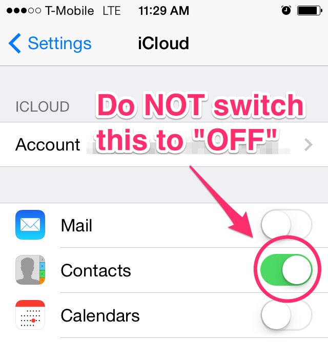 4. Nếu mục “Contacts” đang tắt (với thanh trượt màu trắng), khi đó danh bạ của bạn vẫn chỉ đuợc lưu trên iPhone. Sẽ không có vấn đề gì trừ khi bạn làm mất hoặc hỏng điện thoại, khi đó danh bạ của bạn sẽ bị mất vĩnh viễn vì chưa được sao lưu.