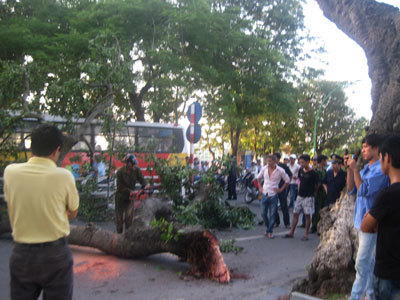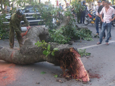 Tại hiện trường, cành đa bị đổ chắn ngang đường có đường kính từ 20 – 30 cm đang được lực lượng dân phòng cưa nhỏ thành từng khúc để mang lên vỉa hè. Chiếc xe máy Suzuki FX bị cành cây làm méo mó, biến dạng của nạn nhân được đưa ra khỏi đống đổ nát.