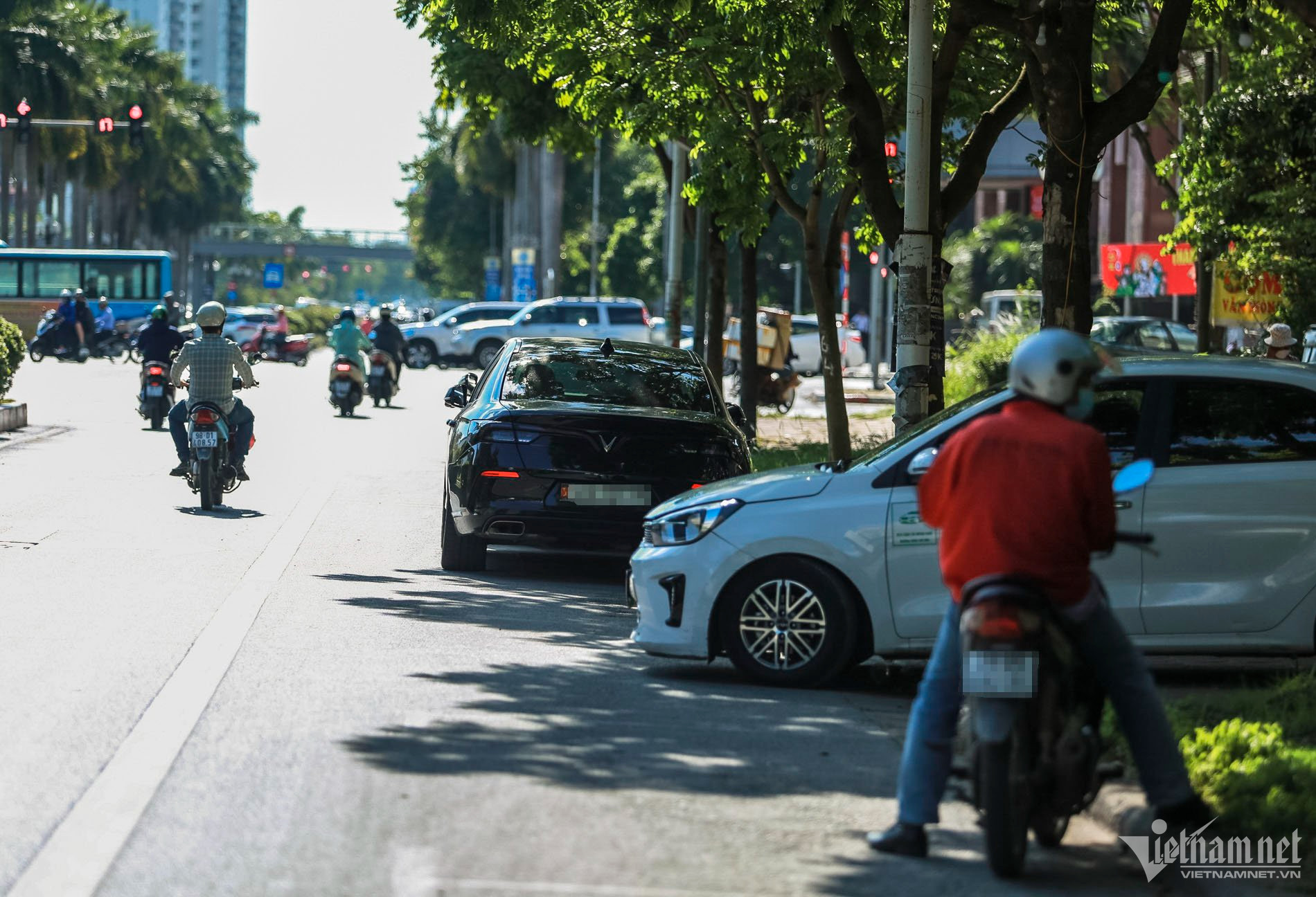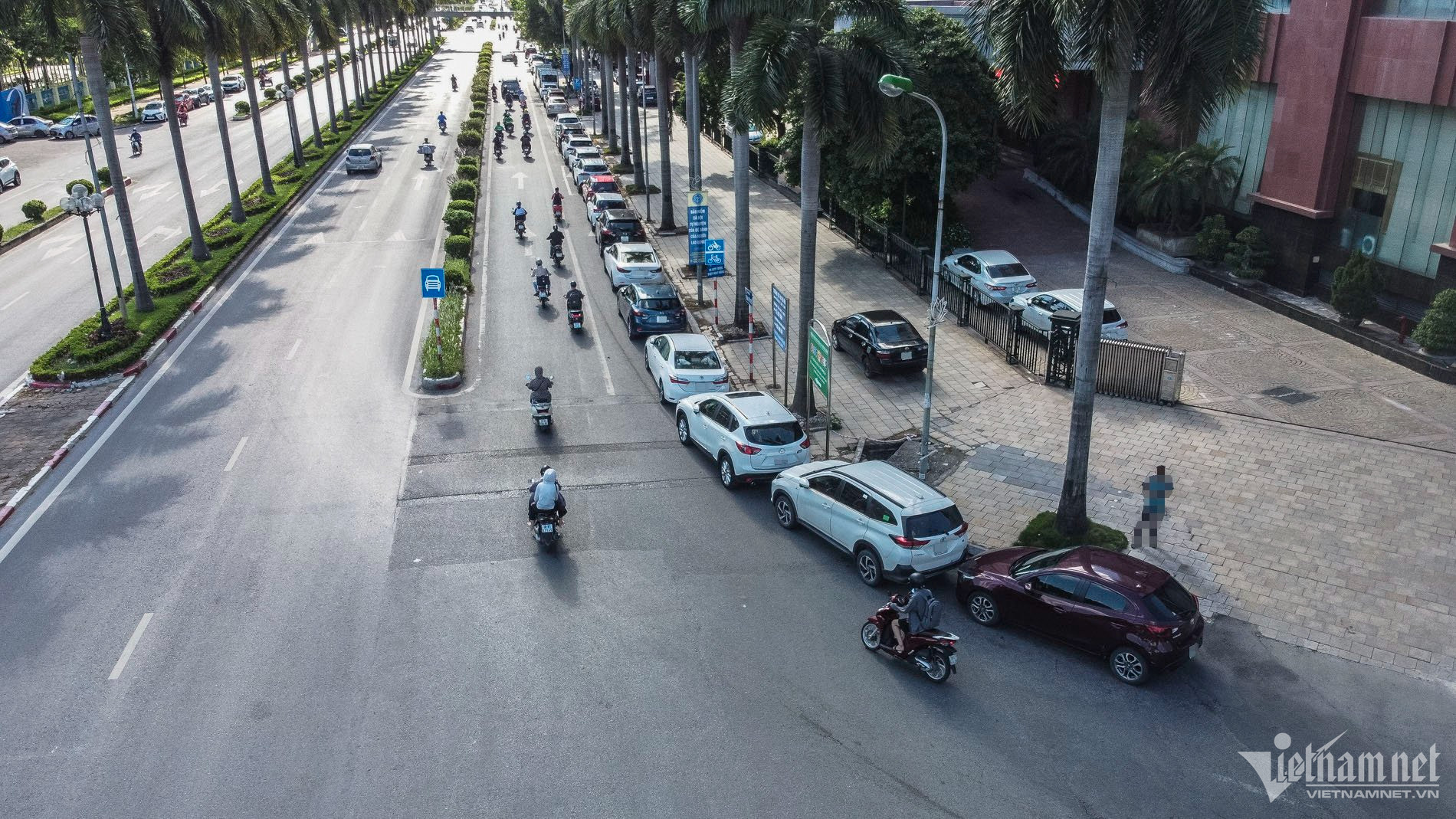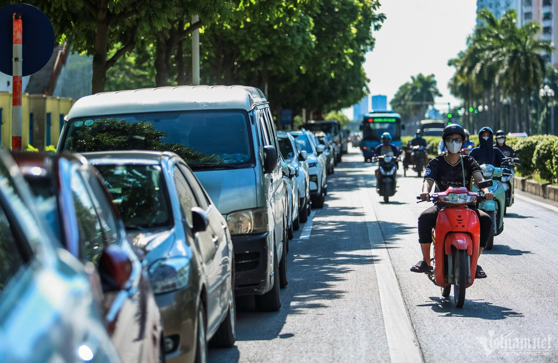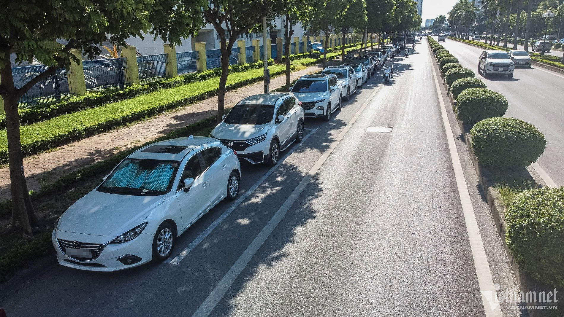 Theo ghi nhận của PV VietNamNet, trên đường Trần Hữu Dực (quận Nam Từ Liêm, Hà Nội) thường xuyên xuất hiện tình trạng xe ô tô đỗ hàng dài dưới lòng đường, vỉa hè gây cản trở giao thông.