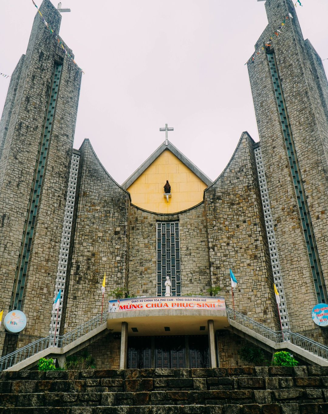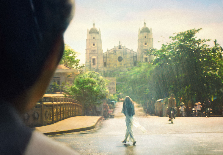 Trong phân đoạn Trịnh Công Sơn đi theo dấu chân Bích Diễm dưới mưa, khán giả có thể thấy hình ảnh của nhà thờ Phủ Cam - một trong những giáo đường lớn nhất, nổi tiếng nhất xứ Huế, nằm trên một ngọn đồi nhỏ có tên là Phước Quả ở bờ nam sông Hương (Ảnh: Phim Em và Trịnh)