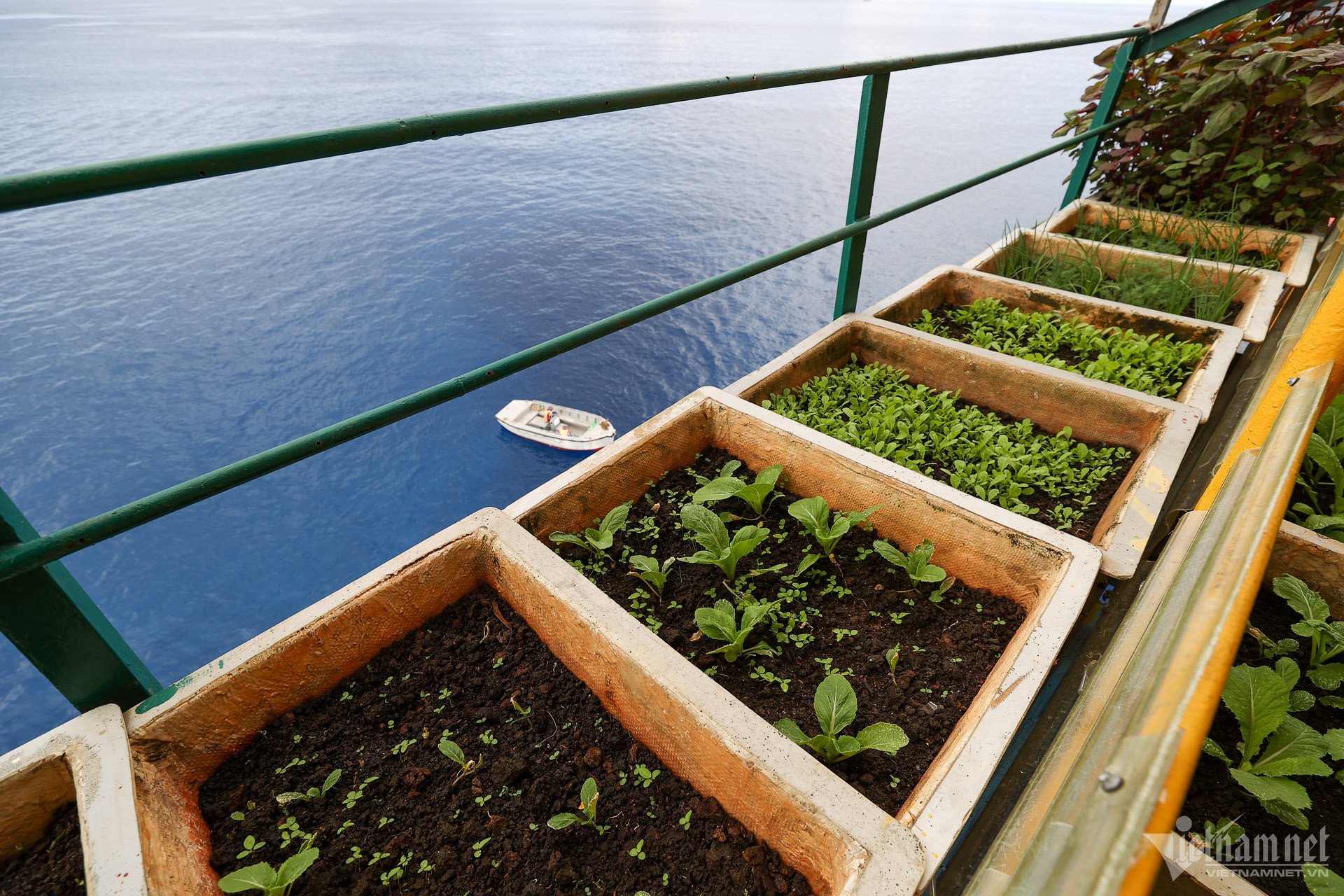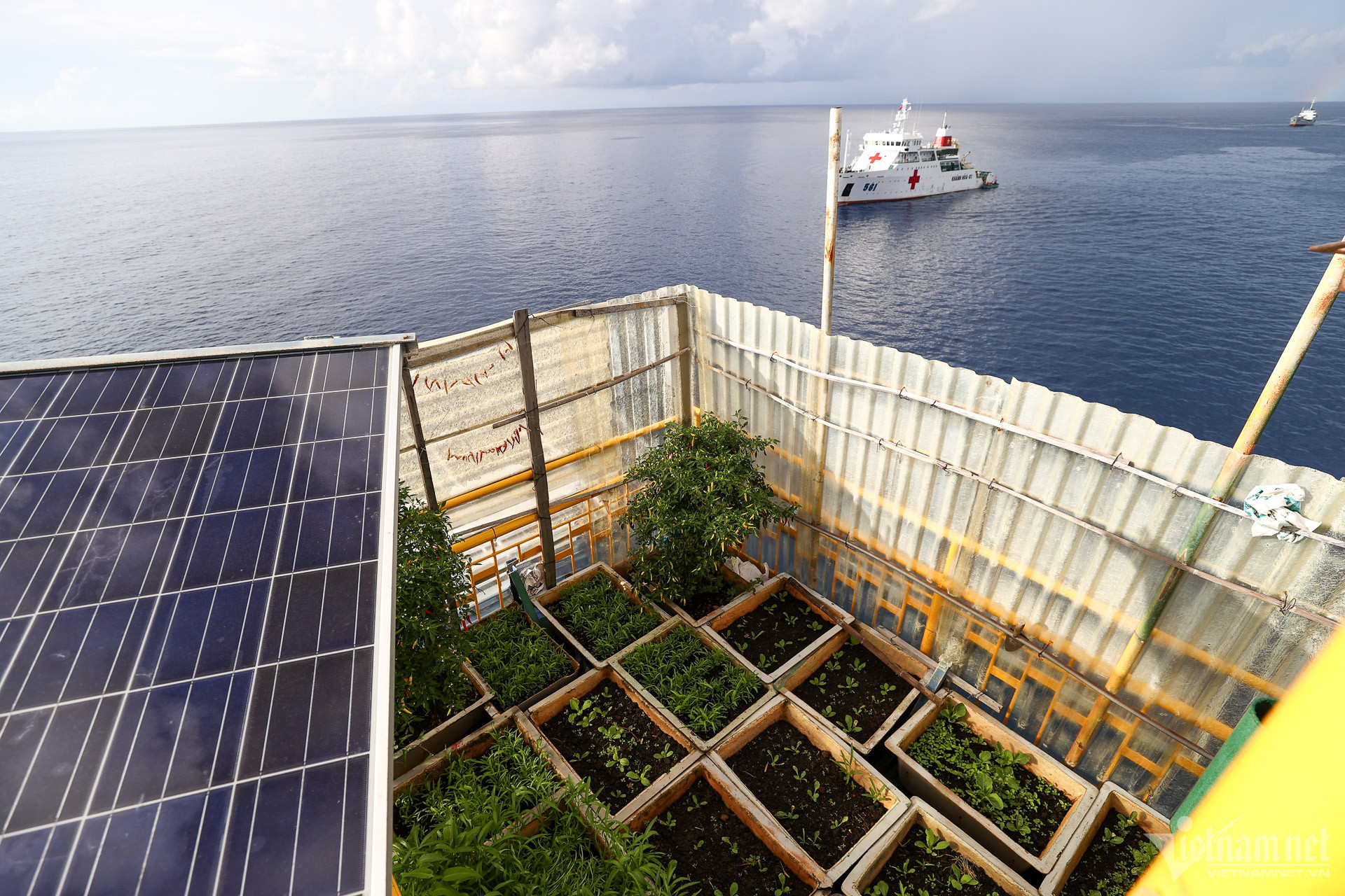 Từ tầng cao nhất của nhà giàn nhìn xuống, mặt biển trải ra mênh mông, nước, trời xanh ngắt đẹp như một bức tranh. Xung quanh hành lang nhà giàn là những thùng nhựa, thùng xốp trồng rau và cả hoa. Các chiến sĩ còn tận dụng các góc nhỏ trên nhà giàn để làm vườn rau xanh cải thiện cho các bữa ăn hàng ngày.