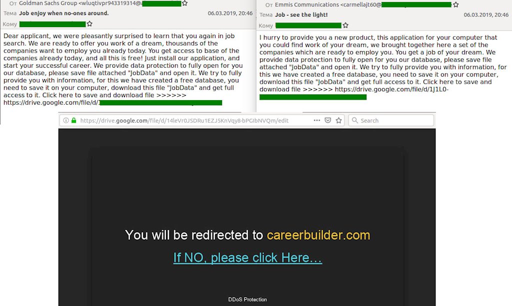 Báo cáo “Spam and Phishing”quý I/2019 của Kaspersky Lab cho thấy, người nhận email spam đã được mời làm những vị trí hấp dẫn trong các công ty lớn. Họ được mời tham gia hệ thống tìm kiếm việc làm miễn phí bằng cách cài đặt ứng dụng đặc biệt vào thiết bị của họ.