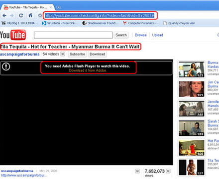 Nhiều người nhận được các đường link chia sẻ video trên trang YouTube từ các nick nặc danh gửi tới dạng http://youtube.com%2Eche[removed]nfig%2Einfo/?video=flash&vid=... Người sử dụng nghĩ rằng, đường link này này mở ra website chia sẻ video clip nổi tiếng thế giới YouTube.com tuy nhiên, thực chất nó lại đưa người dùng tới một website chứa virus.