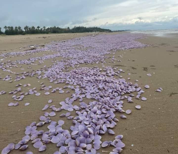 Theo ông Hưng, từ khoảng 18h chiều qua (28/9), ở phần cuối bãi bồi cồn Lu xuất hiện tình trạng ngao giấy (hay còn gọi là ngao bông, có màu tím nhạt) bị sóng đánh dạt vào bờ, số lượng nhiều một cách bất thường, xếp thành bãi dài hàng chục mét.