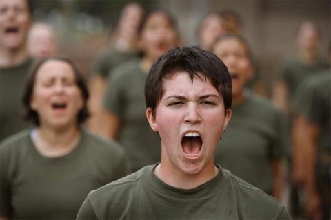 Nữ tân binh trả lời người hướng dẫn tập luyện tại trại lính ở Parris Island,