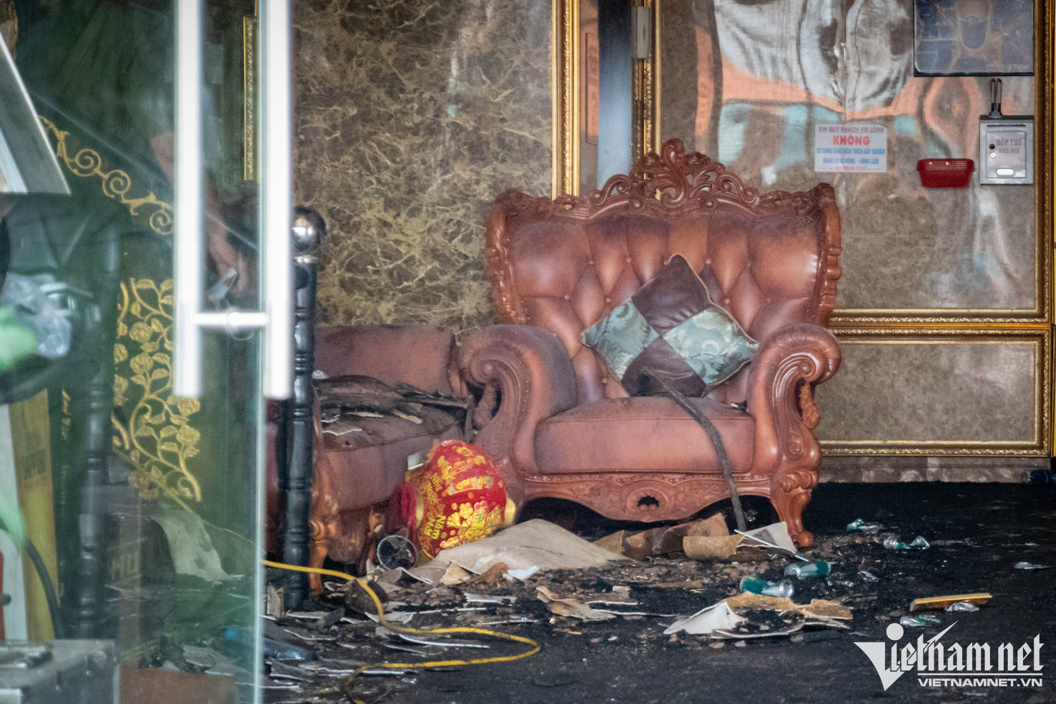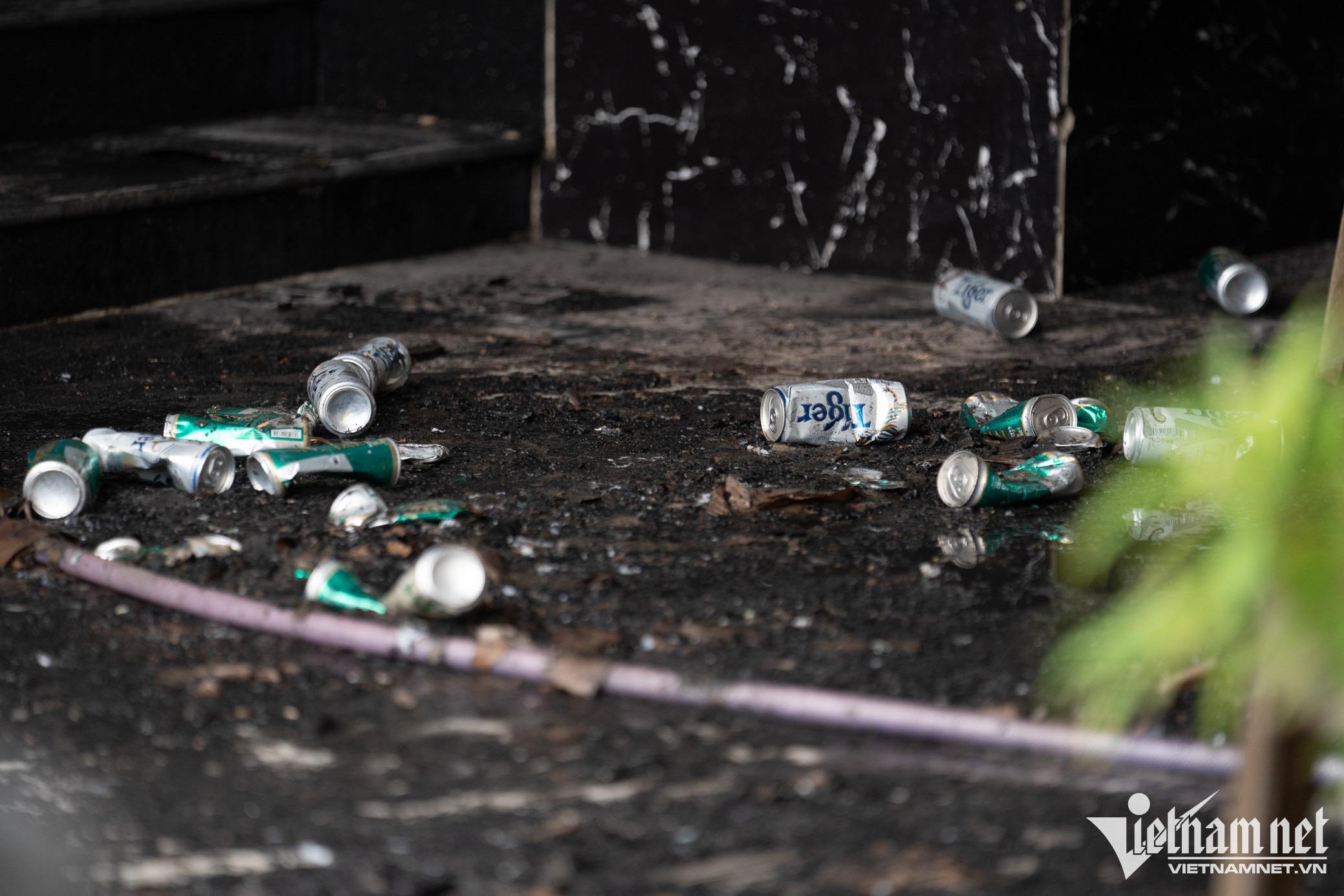 Nhiều lon bia chưa khui vương vãi trên sàn nhà, hệ thống đèn chiếu sáng, bảng hiệu bị cháy đen một phần.