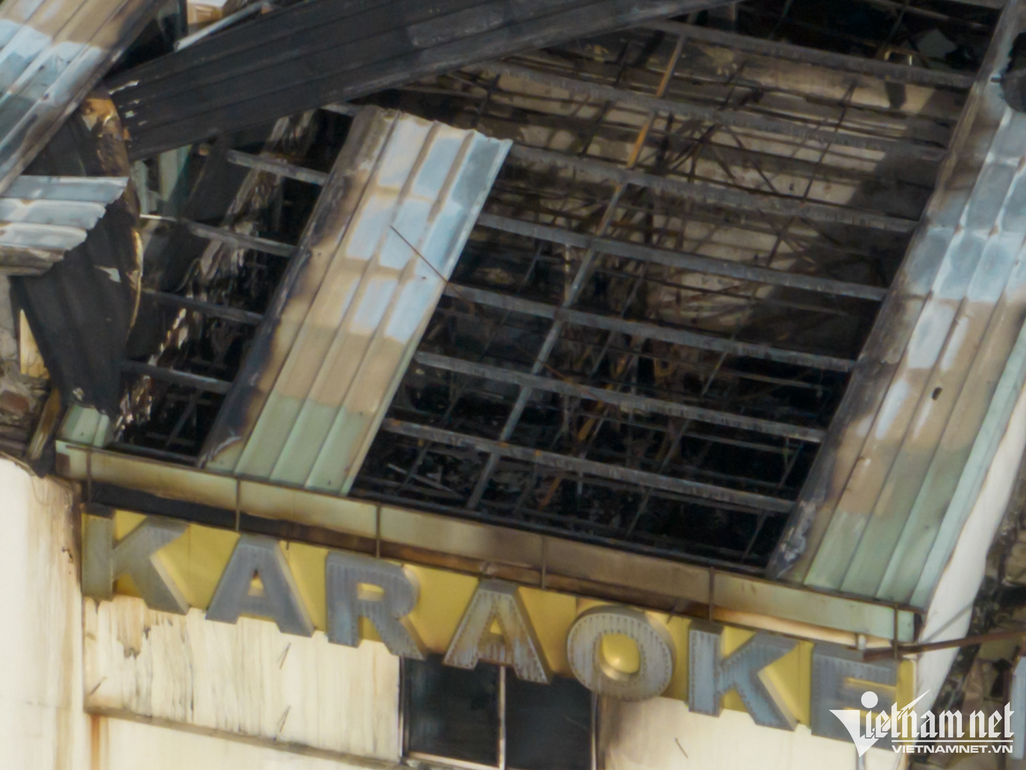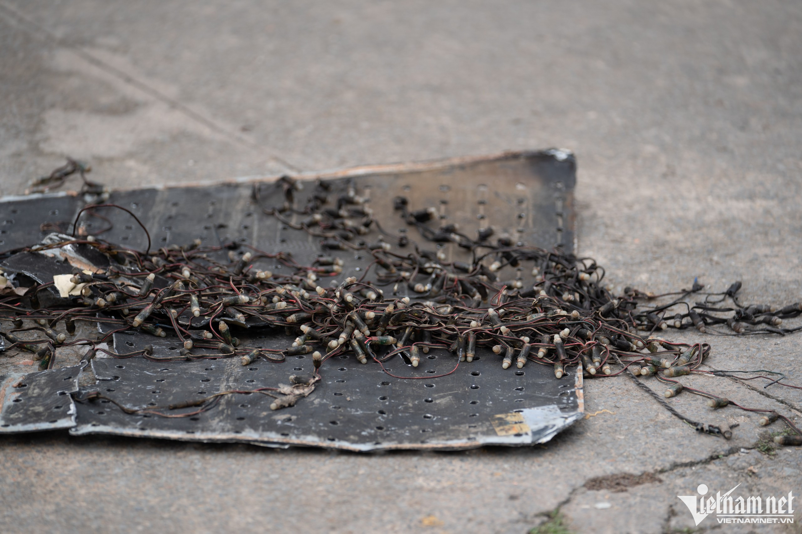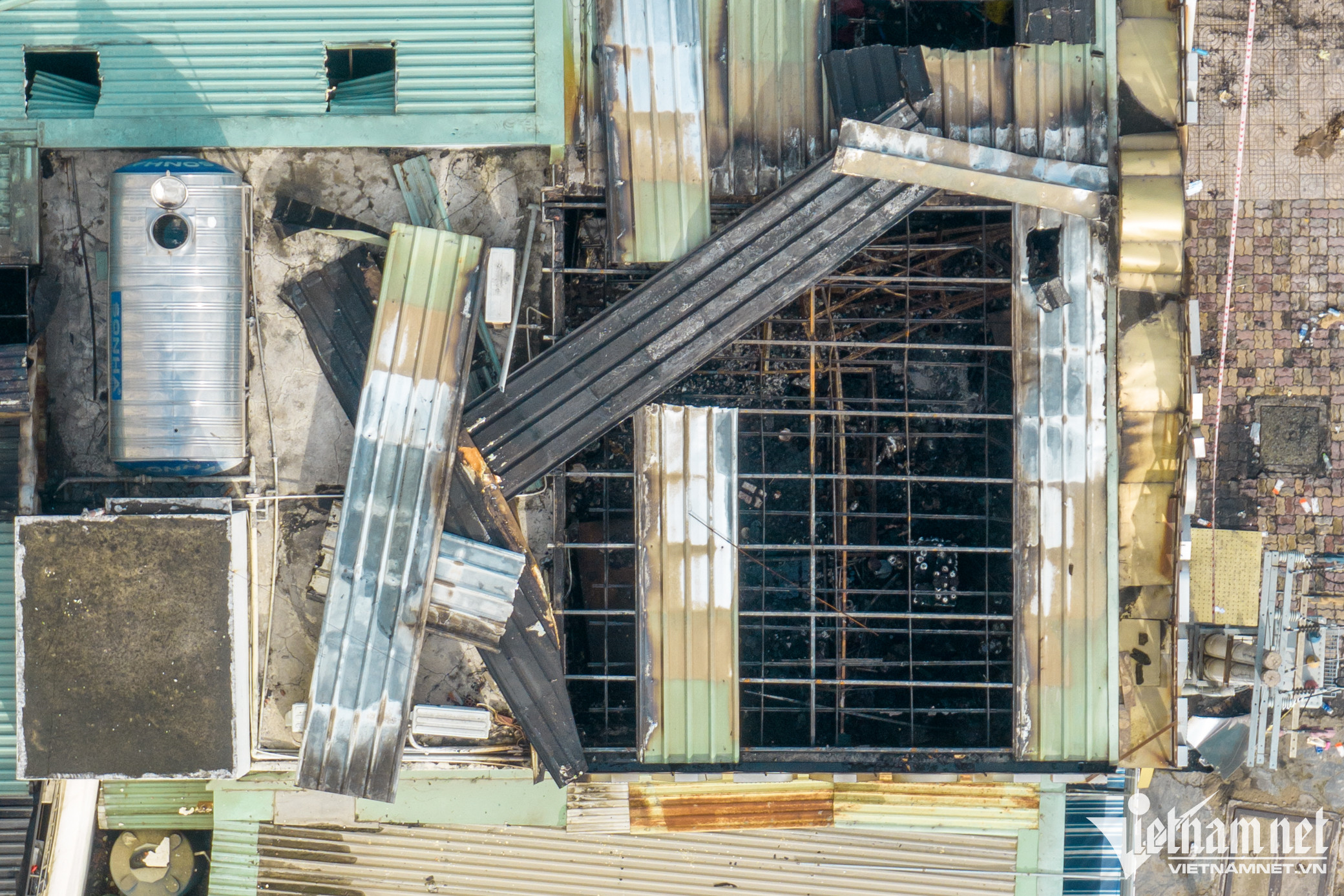 Nhìn từ trên cao, phần khung ngôi nhà ống đã bị cháy trụi. Bên trong tất cả vật dụng đều cháy thành tro và sắt vụn.