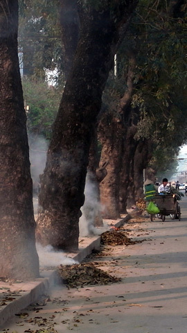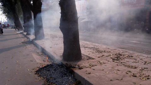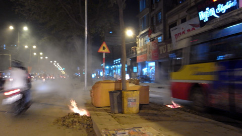 thì công nhân môi trường lại đốt dưới lòng đường, những làn khói trên phố
