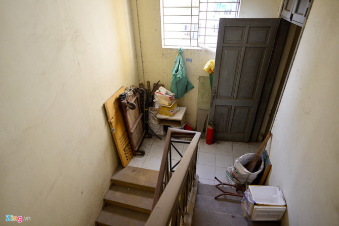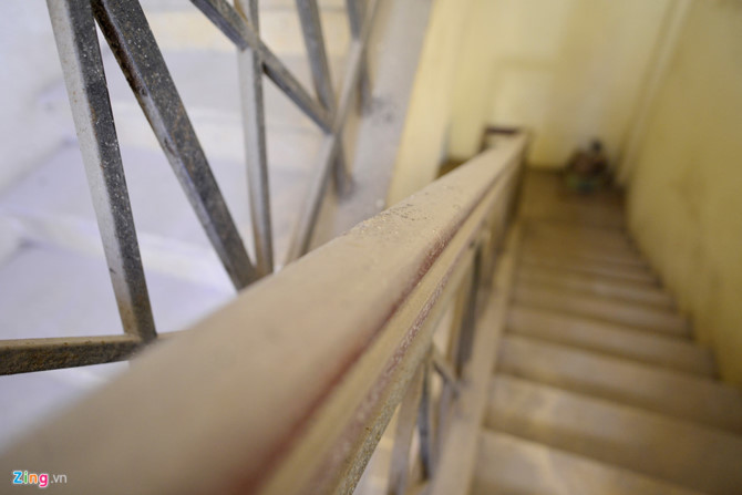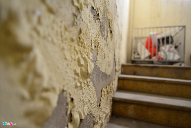 Lối đi cầu thang bụi bặm, tường bong tróc...