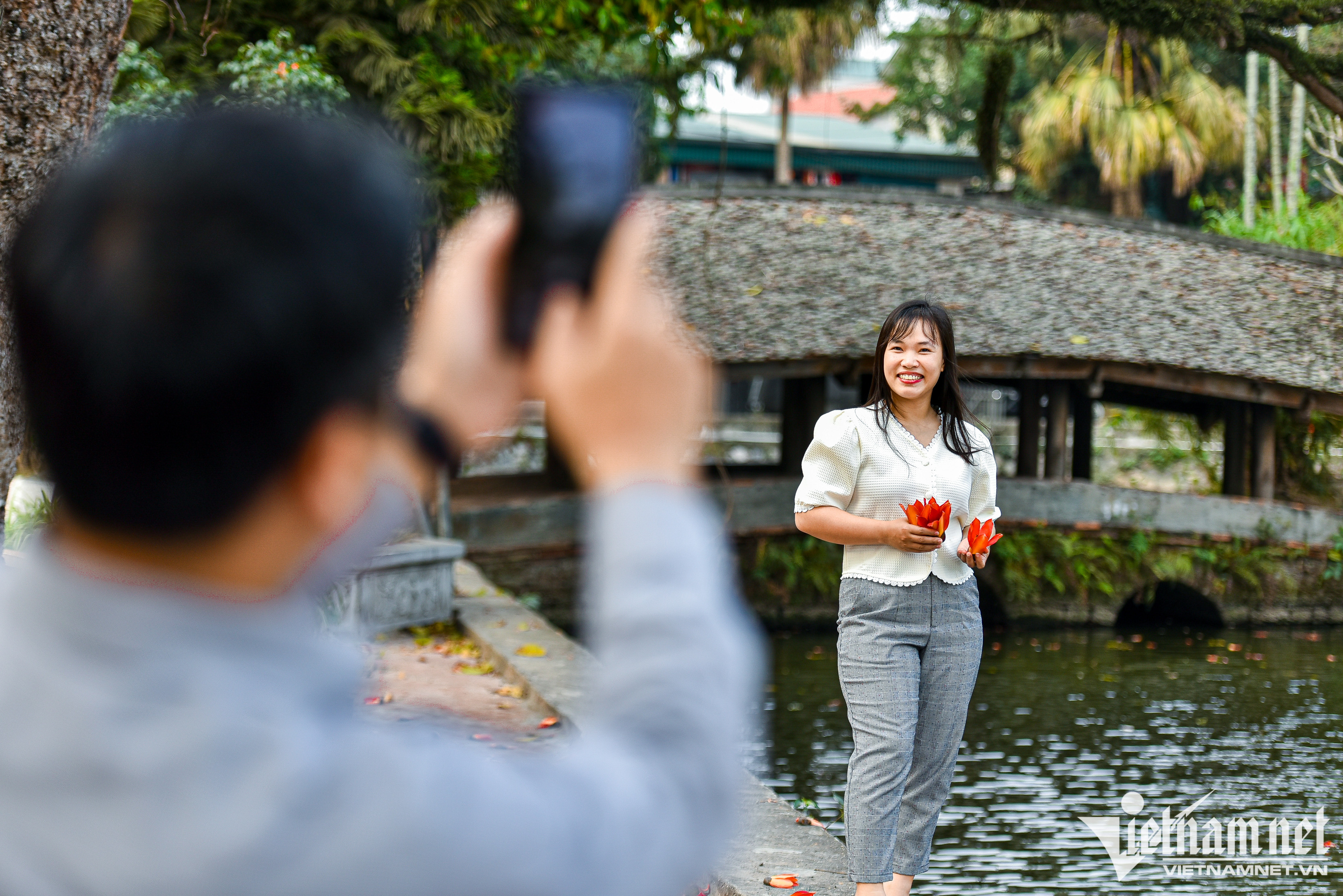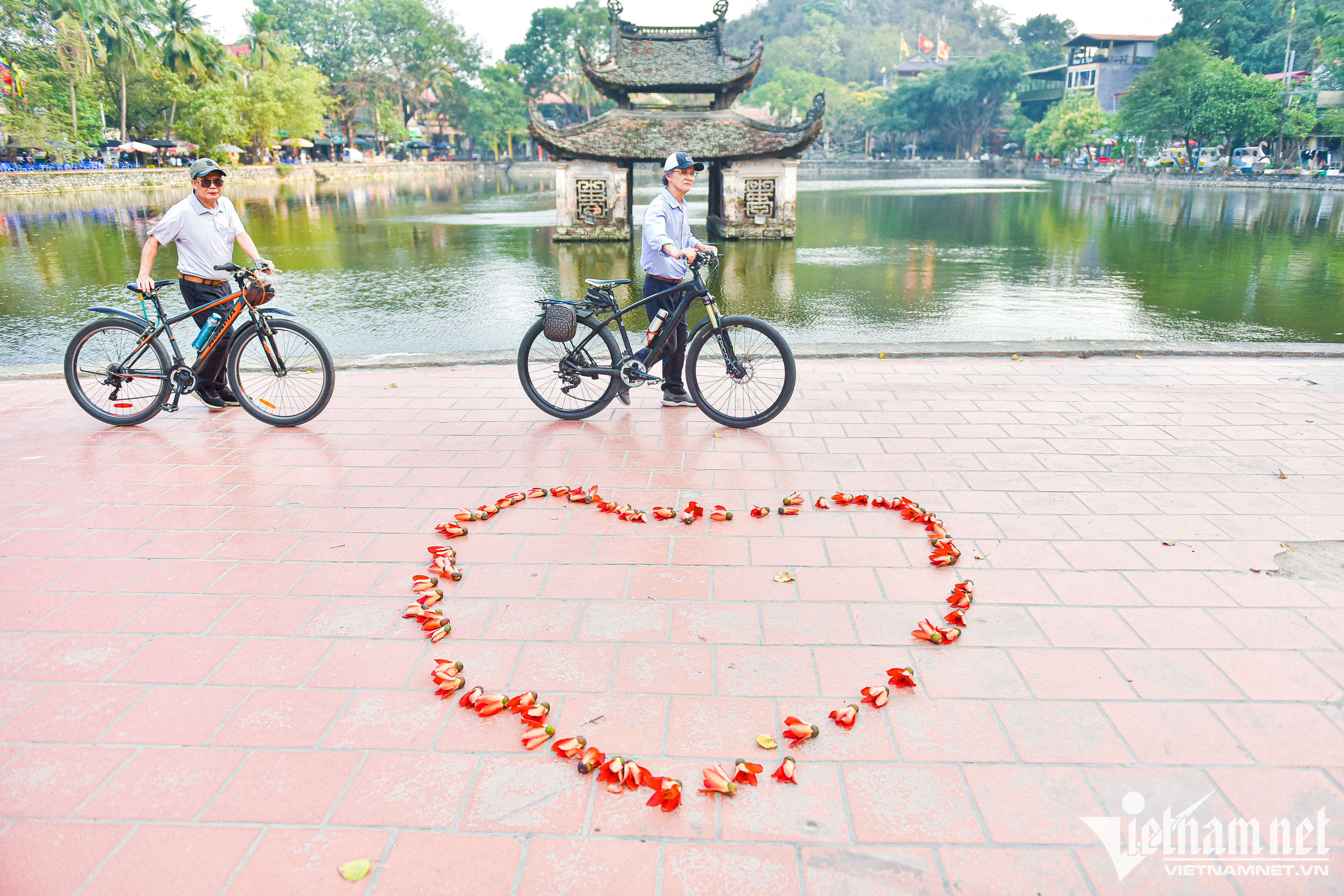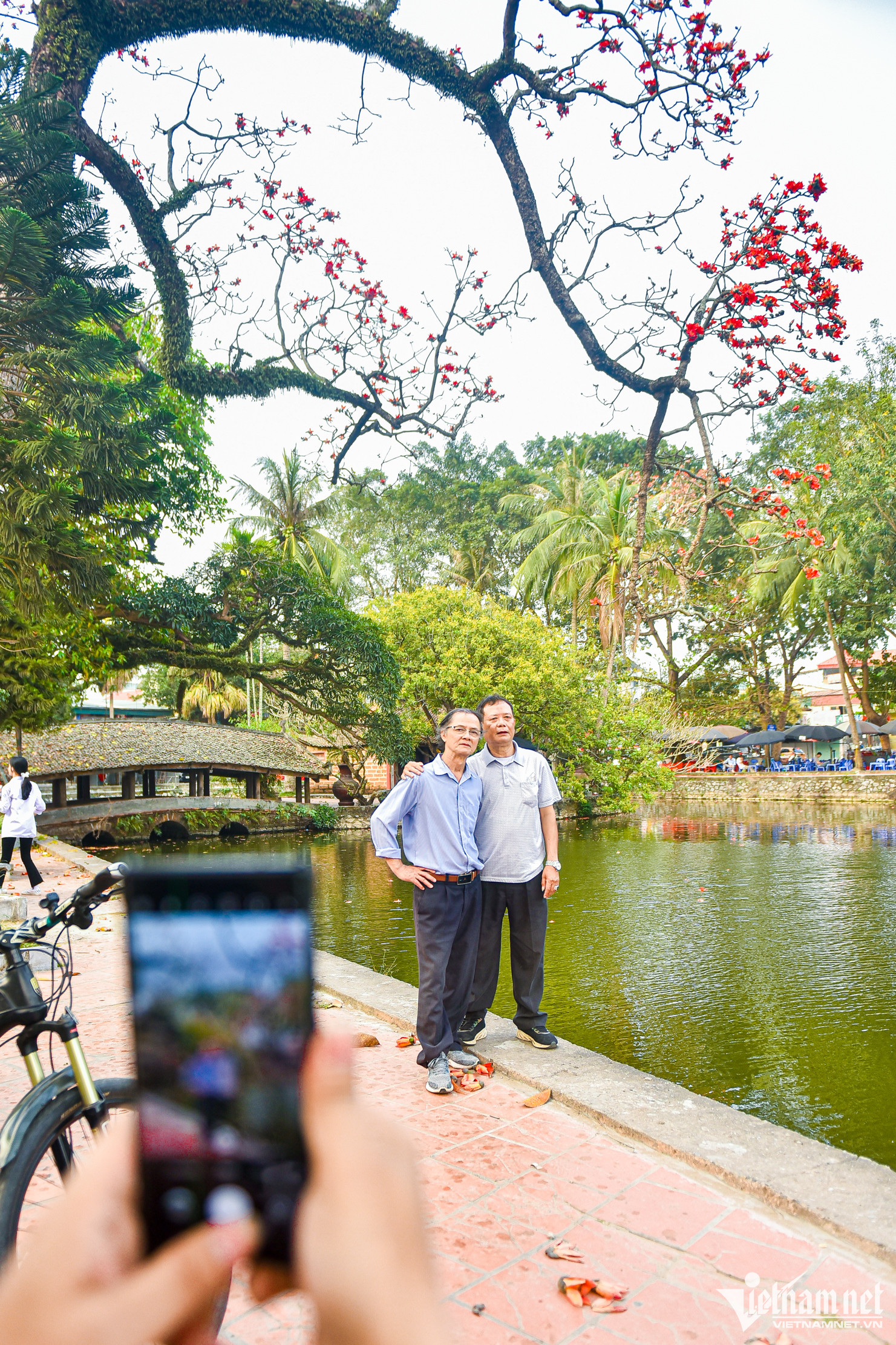 "Hoa gạo đẹp, đẹp một cách đặc trưng, vừa mang màu đỏ rực rỡ giữa khung cảnh thiên nhiên vừa ẩn chứa nét bình yên, êm đềm của quê hương xứ Đoài. Mỗi sáng sớm, chiều muộn, khi đạp xe ngang chùa Thầy, tôi đều dừng lại nghỉ chân, ngắm mùa hoa gạo. Khi ấy, tâm hồn nhẹ nhàng, thư thái và đan xen cả sự tự hào với vẻ đẹp quê hương", ông Phan Văn Hùng và ông Phan Văn Tước (Hữu Bằng, Thạch Thất, Hà Nội) chia sẻChùa Thầy thuộc địa phận xã Sài Sơn, huyện Quốc Oai (Hà Nội) được Nhà nước chính thức công nhận là di tích Quốc gia đặc biệt kể từ năm 2015. Mỗi năm, chùa Thầy đón hàng vạn lượt du khách thập phương về tham quan, lễ báiThủy Đình cổ kính, rêu phong, được ví là viên ngọc giữa miệng rồng là kiến trúc biểu tượng của chùa Thầy. Vào những ngày lễ hội, nơi này trở thành sân khấu của các nghệ sĩ múa rối nước. Mùa hoa gạo, người dân, du khách thường nhặt những cánh hoa rơi, xếp thành hình xinh xắn để chụp ảnh, ngắm nhìn khi tới chùaTại Hà Nội không còn nhiều những cây gạo cổ thụ như chùa Thầy. Trong nội thành, du khách có thể ngắm nhìn cây gạo cổ thụ trên đường Đinh Tiên Hoàng, đoạn đối diện tượng đài Lý Thái Tổ, cây gạo ở Bảo tàng Lịch sử Việt Nam hoặc cây gạo ở ngã ba Phương Mai - Giải Phóng...Hoa gạo thường chỉ nở trong một tháng. Theo Đông y, toàn bộ cây gạo được sử dụng làm thuốc với tác dụng thanh nhiệt, giải độc. Riêng hoa được sử dụng chữa nhiều bệnh như viêm loét dạ dày, tá tràng
