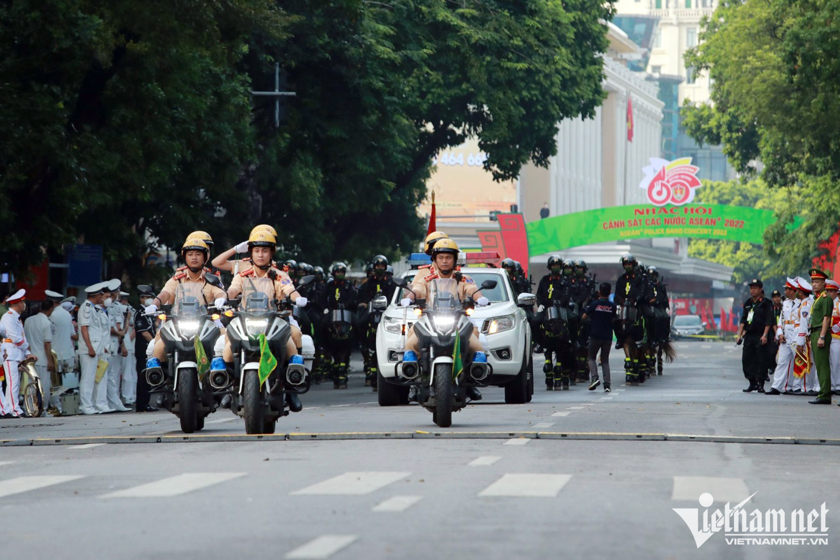 Sáng sớm 9/7, đông đảo cán bộ, chiến sĩ cảnh sát và người dân tới dự Chương trình biểu diễn diễu hành Nhạc hội Cảnh sát các nước ASEAN+ 2022.Bộ trưởng Bộ Công an Tô Lâm tại buổi lễ.Nhạc hội Cảnh sát các nước ASEAN+ 2022 là sự kiện âm nhạc có quy mô lớn nhất từ trước đến nay do Bộ Công an Việt Nam đăng cai tổ chức.Sự xuất hiện của lực lượng Cảnh sát kỵ binh thu hút khán giả.Tham dự sự kiện có 8 đoàn nhạc, trong đó có 6 đoàn nhạc quốc tế với 200 nhạc công, nghệ sĩ đến từ các nước Trung Quốc, Nhật Bản, Philippines, Lào, Myanmar, Brunei. Riêng Việt Nam có 2 đoàn nhạc với 238 nhạc công, nghệ sĩ, trong đó đoàn nhạc Bộ Công an có 127 người. Đoàn nhạc của Bộ Quốc phòng có 110 người. Nghi lễ diễu hành của lực lượng Cảnh sát Việt Nam.Trước đó, vào chiều 8/7, các đoàn nhạc đã cùng tổng duyệt chương trình này quanh Hồ Hoàn Kiếm.Các đoàn diễu hành trên phố đi bộ xung quanh Hồ Hoàn Kiếm, có dừng lại biểu diễn tại 4 địa điểm: Tượng đài vua Lý Thái Tổ, Tượng đài cảm tử; Đài phun nước ngã ba phố Đinh Tiên Hoàng, Lý Thái Tổ; ngã tư Hàng Khay, Hàng Bài, Đinh Tiên Hoàng, Tràng Tiền.Tiết mục múa rồng của đoàn Việt Nam.Tiết mục của đoàn Cảnh sát Philippines.Các nữ vũ công cảnh sát đến từ Myanmar.Nhạc hội Cảnh sát các nước ASEAN+2022 diễn ra nhằm tăng cường giao lưu văn hoá âm nhạc, nâng cao sự hiểu biết lẫn nhau về bản sắc dân tộc, đất nước, con người, truyền thống lực lượng Cảnh sát nhân dân Việt Nam và lực lượng Cảnh sát các nước ASEAN+.