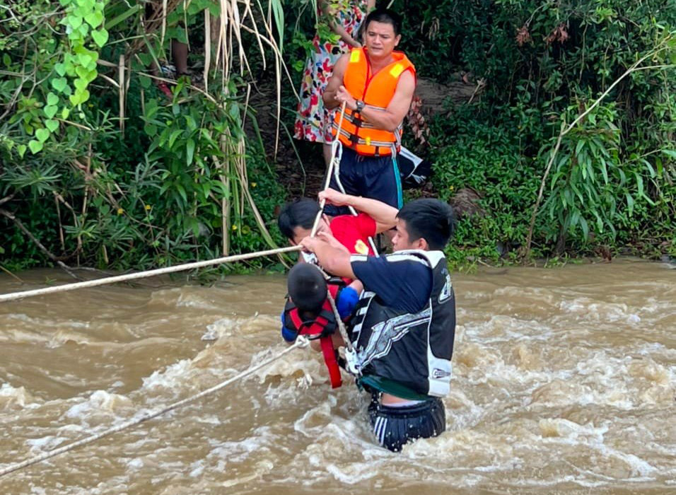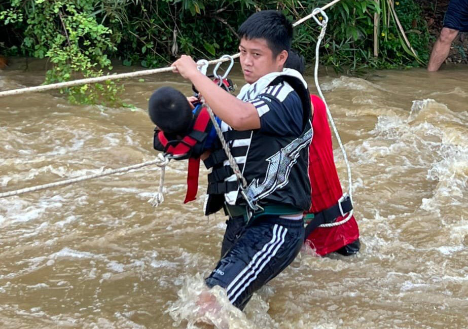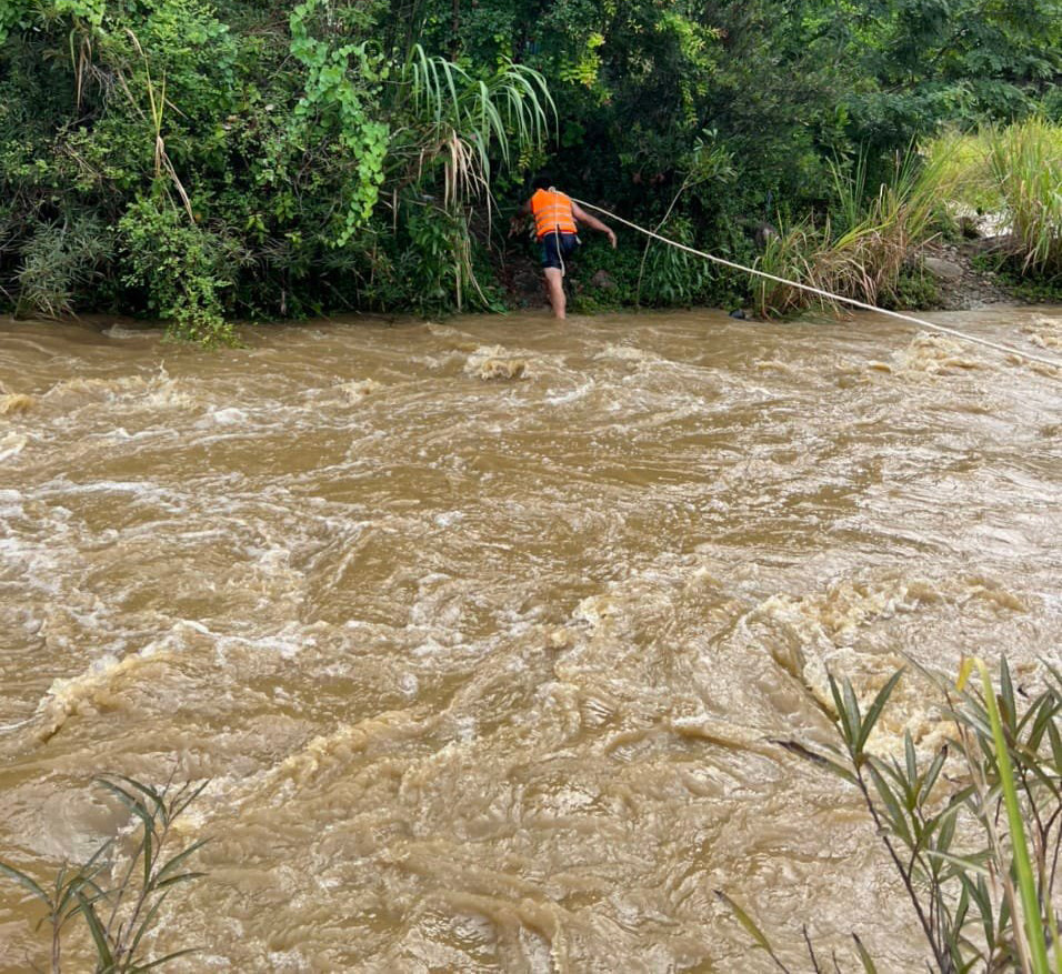 Các chiến sĩ dò đường qua suối, giăng dây về phía những người bị mắc kẹt để cứu hộ. Tuy nhiên, do nước dâng cao nên việc cứu hộ, cứu nạn gặp nhiều khó khăn.