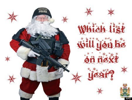 Trong khi đó, tại Abbotsford (Canada), các nhân viên cảnh sát đang gửi những tấm thiệp Giáng sinh in hình cảnh sát trưởng mặc bộ đồ của ông già Noel và cầm súng trên tay tới cho các găng-tơ và những kẻ buôn má túy.
