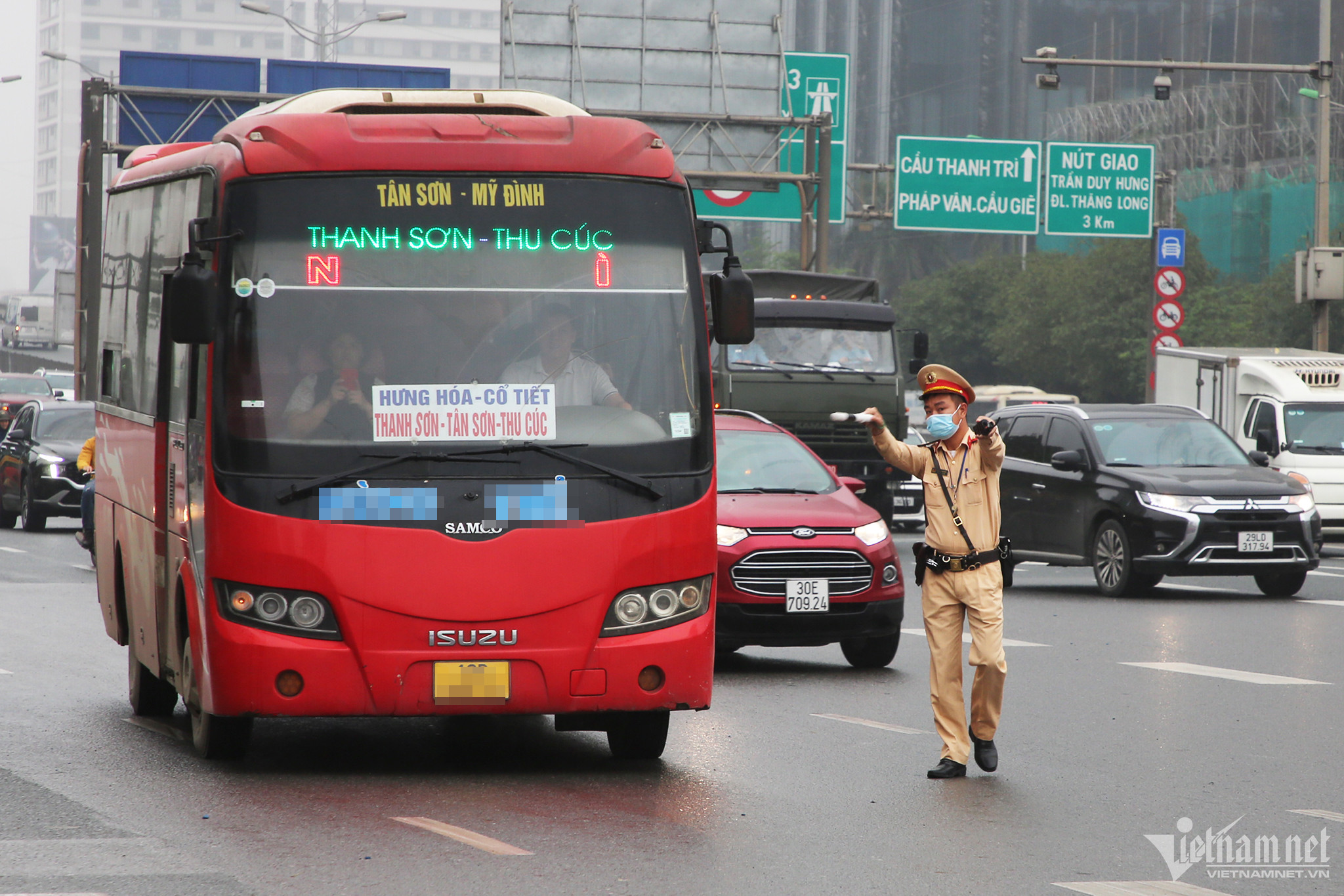 Sáng 13/4, Đội CSGT đường bộ số 6 (Phòng CSGT Công an TP Hà Nội) và Đội CSGT - Trật tự Công an quận Cầu Giấy lập chốt xử lý vi phạm trật tự an toàn giao thông trên đường Phạm Hùng (khu vực trước cổng bến xe Mỹ Đình).