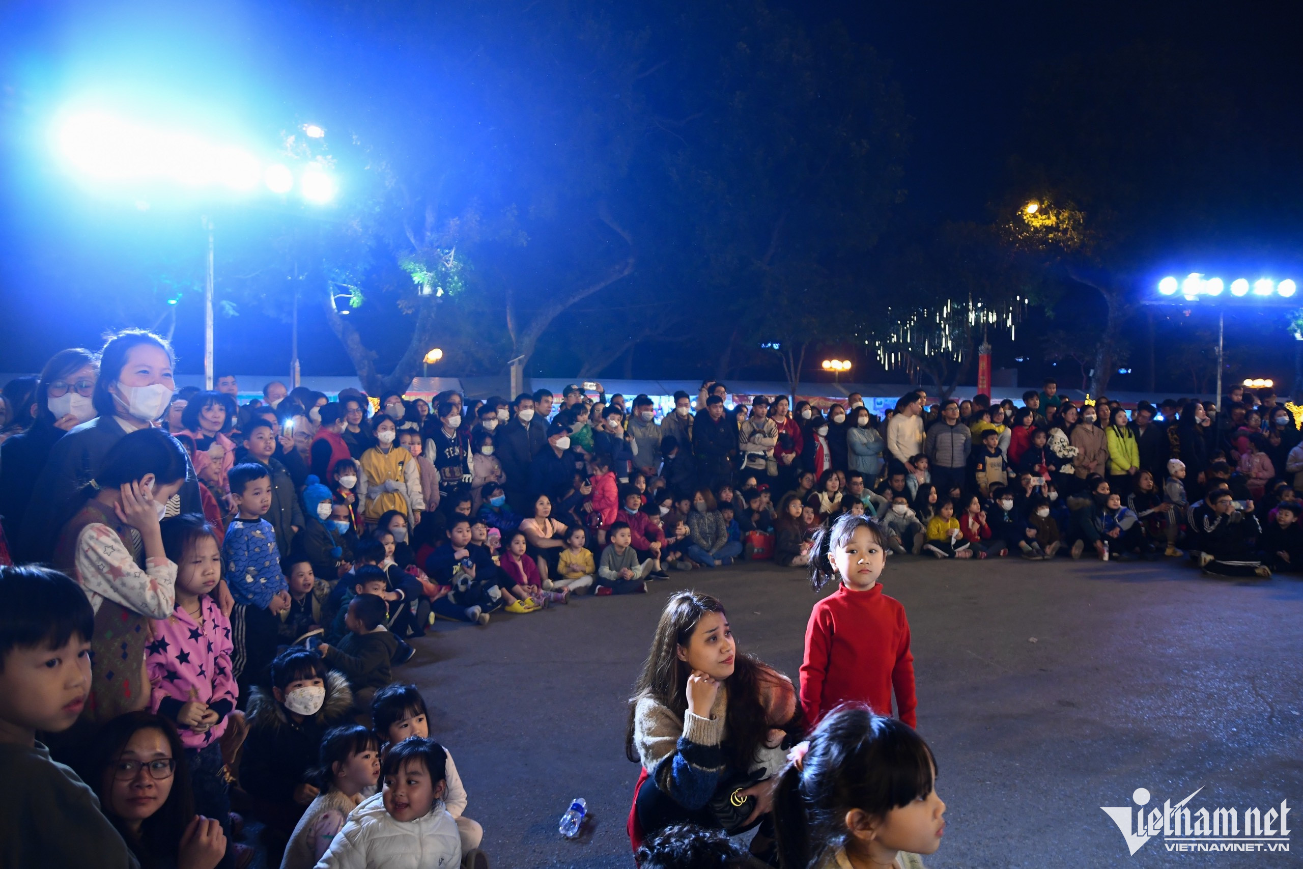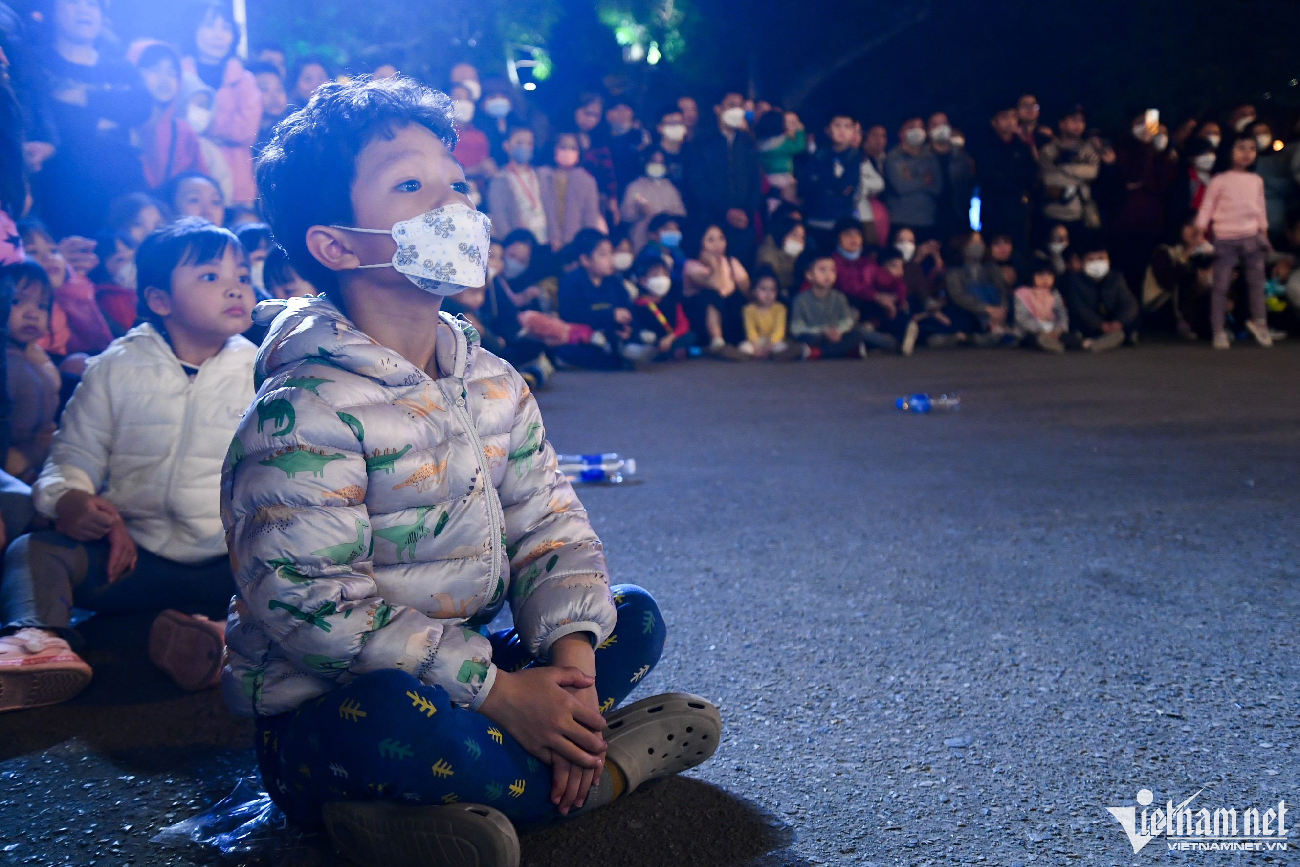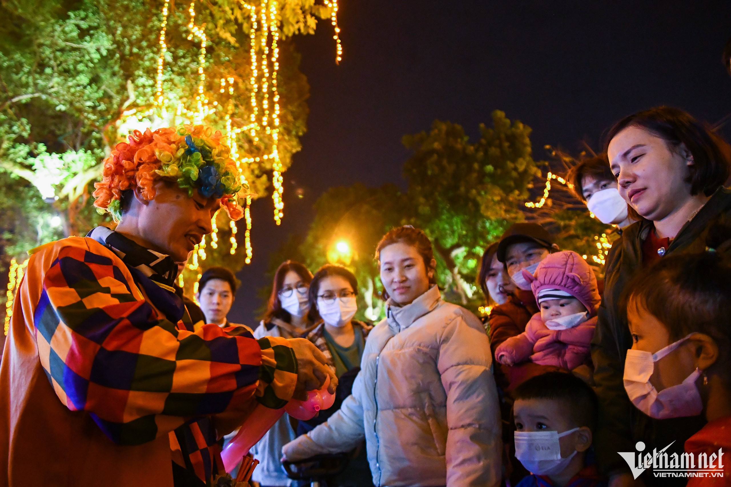 Ngoài biểu diễn văn nghệ, đàn hát, ở phố đi bộ Trần Nhân Tông còn có biểu diễn xiếc miễn phí, thu hút hàng trăm bạn nhỏ và người lớn tới xem.