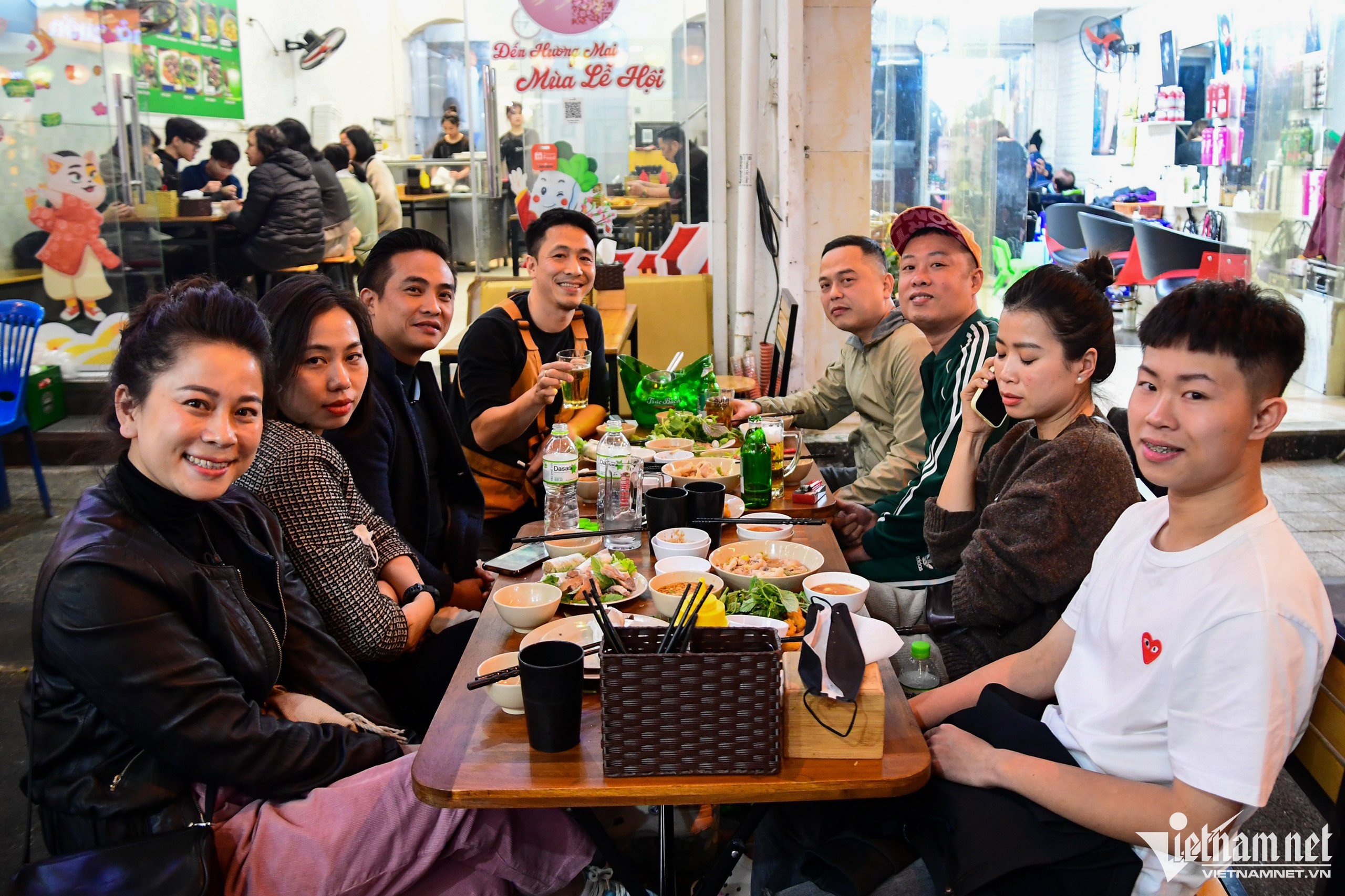 Anh Hiếu (áo xanh, bên trái) cho biết, anh và bạn bè đến đây vì tò mò muốn xem phố ẩm thực kết hợp với đi bộ ở Đảo Ngọc (quận Ba Đình) ra sao. "Khi đến đây chúng tôi hơi thất vọng vì không gian phố đi bộ bé, ít hoạt động vui chơi", anh nói.